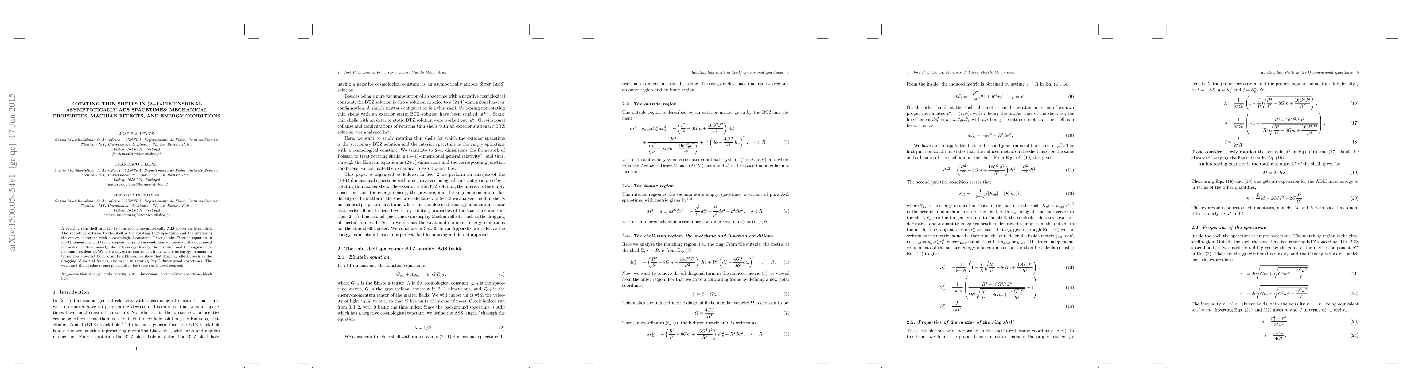 A rotating thin shell in a (2+1)-dimensional asymptotically AdS spacetime is studied. The spacetime exterior to the shell is the rotating BTZ spacetime and the interior is the empty spacetime with a cosmological constant. Through the Einstein equation in (2+1)-dimensions and the corresponding junction conditions we calculate the dynamical relevant quantities, namely, the rest energy-density, the pressure, and the angular momentum flux density. We also analyze the matter in a frame where its energy-momentum tensor has a perfect fluid form. In addition, we show that Machian effects, such as the dragging of inertial frames, also occur in rotating (2+1)-dimensional spacetimes. The weak and the dominant energy condition for these shells are discussed.