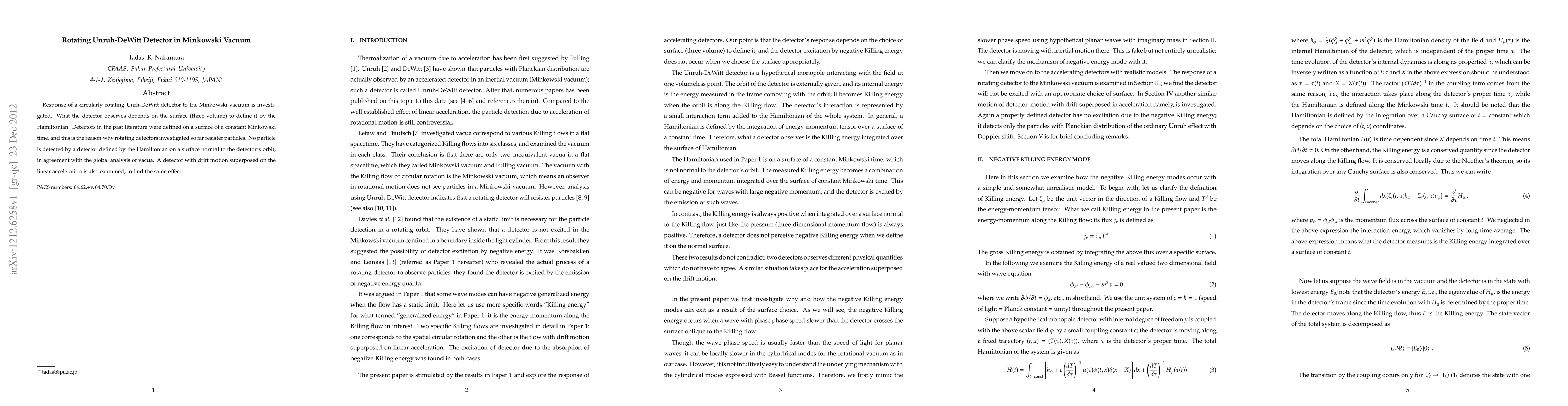 Response of a circularly rotating Unrh-DeWitt detector to the Minkowski vacuum is investigated. What the detector observes depends on the surface (three volume) to define it by the Hamiltonian. Detectors in the past literature were defined on a surface of a constant Minkowski time, and this is the reason why rotating detectors investigated so far resister particles. No particle is detected by a detector defined by the Hamiltonian on a surface normal to the detector's orbit, in agreement with the global analysis of vacua. A detector with drift motion superposed on the linear acceleration is also examined, to find the same effect.
