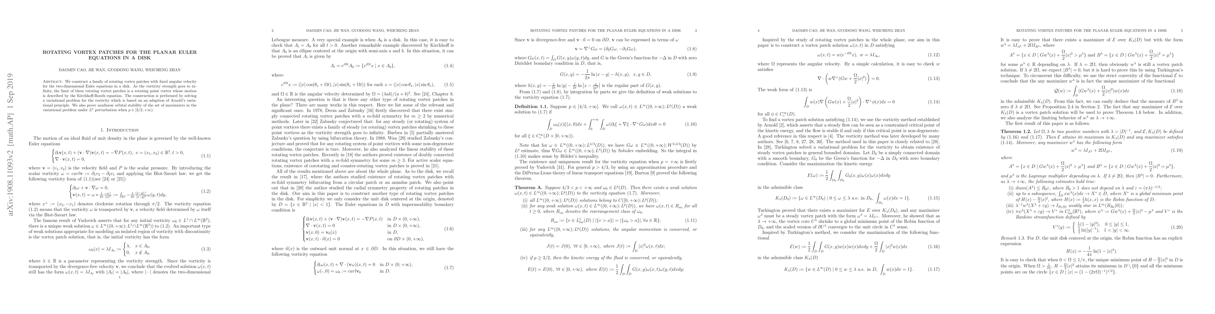 This paper constructs rotating vortex patches with fixed angular velocity for the 2D Euler equations in a disk and proves their convergence to a rotating point vortex described by the Kirchhoff-Routh equation as the vorticity strength tends to infinity, using a variational principle adapted from Arnold's work. It also establishes nonlinear orbital stability for these vortex patches under $L^p$ perturbations for $p \in [3/2, +\infty)$.