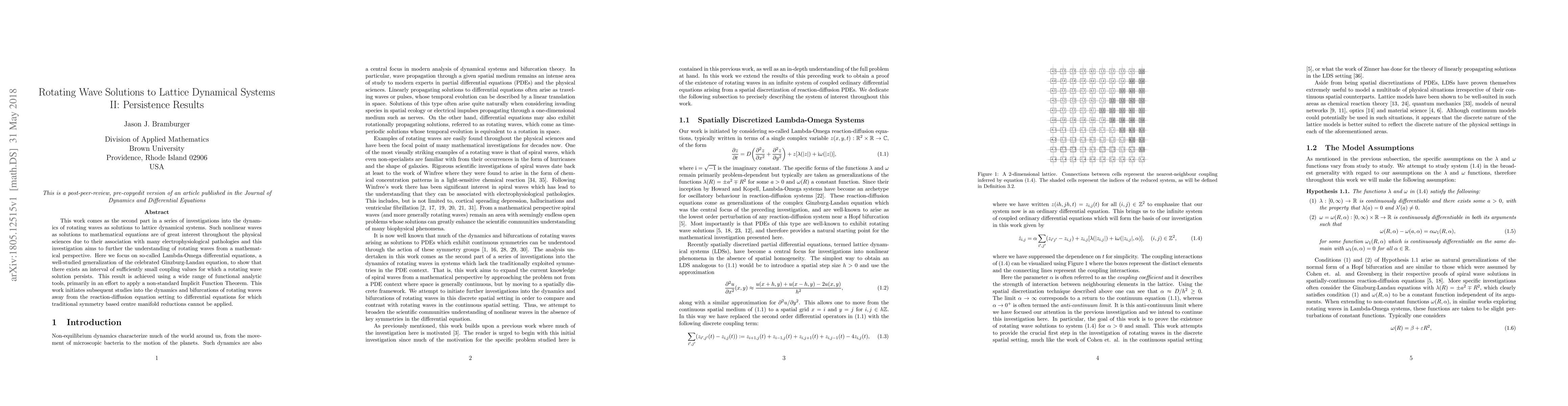 This work comes as the second part in a series of investigations into the dynamics of rotating waves as solutions to lattice dynamical systems. Such nonlinear waves as solutions to mathematical equations are of great interest throughout the physical sciences due to their association with many electrophysiological pathologies and this investigation aims to further the understanding of rotating waves from a mathematical perspective. Here we focus on so-called Lambda-Omega differential equations, a well-studied generalization of the celebrated Ginzburg-Landau equation, to show that there exists an interval of sufficiently small coupling values for which a rotating wave solution persists. This result is achieved using a wide range of functional analytic tools, primarily in an effort to apply a non-standard Implicit Function Theorem. This work initiates subsequent studies into the dynamics and bifurcations of rotating waves away from the reaction-diffusion equation setting to differential equations for which traditional symmetry based centre manifold reductions cannot be applied.