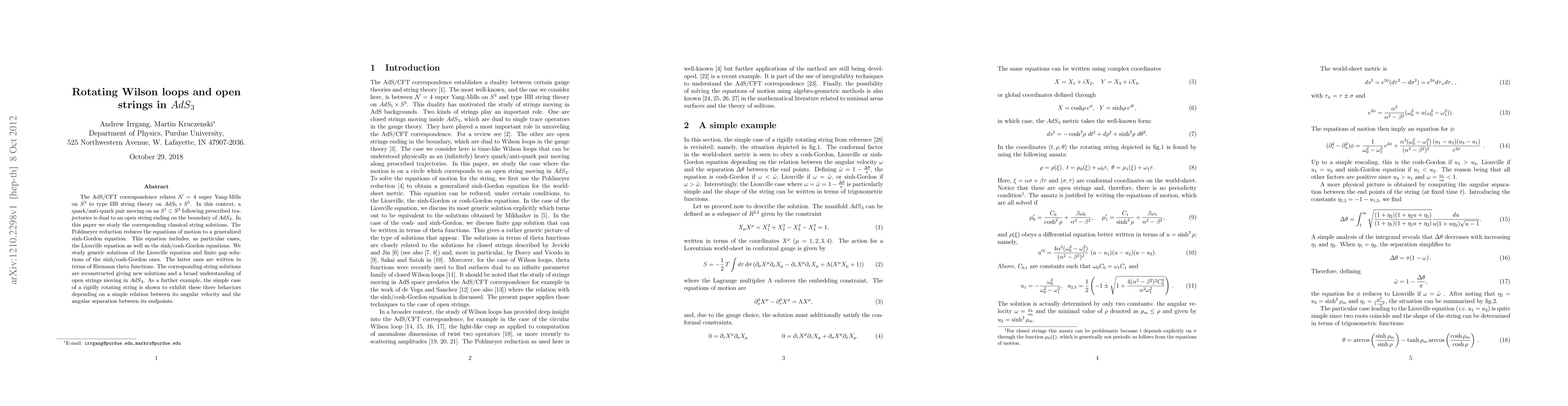 The AdS/CFT correspondence relates N=4 super Yang-Mills on S3 to type IIB string theory on AdS5xS5. In this context, a quark/anti-quark pair moving on an S1 inside S3 following prescribed trajectories is dual to an open string ending on the boundary of AdS3. In this paper we study the corresponding classical string solutions. The Pohlmeyer reduction reduces the equations of motion to a generalized sinh-Gordon equation. This equation includes, as particular cases, the Liouville equation as well as the sinh/cosh-Gordon equations. We study generic solutions of the Liouville equation and finite gap solutions of the sinh/cosh-Gordon ones. The latter ones are written in terms of Riemann theta functions. The corresponding string solutions are reconstructed giving new solutions and a broad understanding of open strings moving in AdS3. As a further example, the simple case of a rigidly rotating string is shown to exhibit these three behaviors depending on a simple relation between its angular velocity and the angular separation between its endpoints.