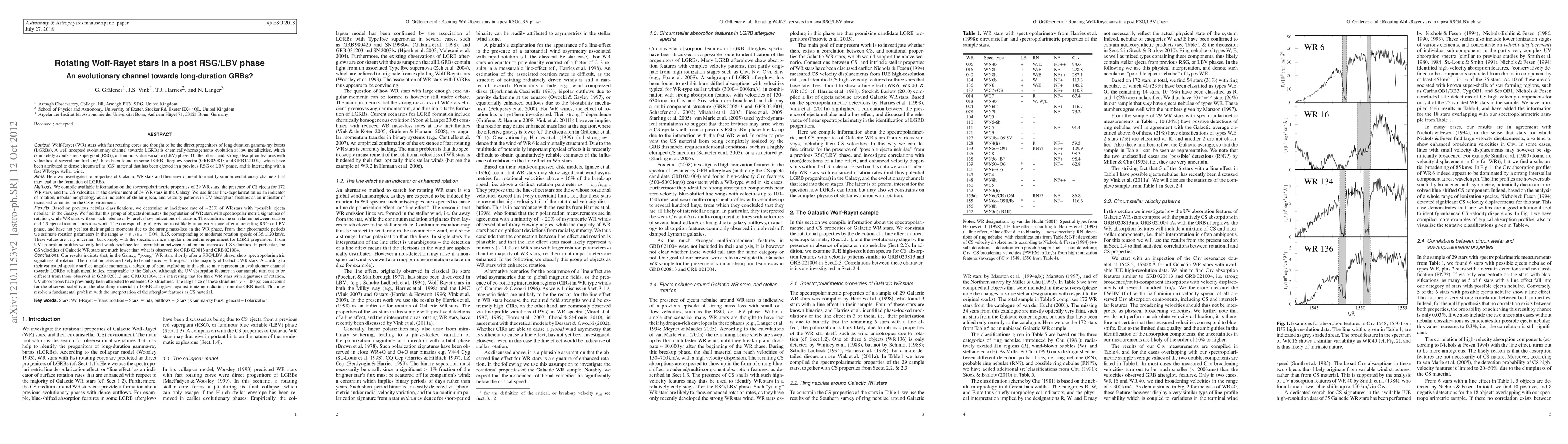 (shortened) We investigate the properties of Galactic WR stars and their environment to identify evolutionary channels that may lead to the formation of LGRBs. To this purpose we compile available information on the spectropolarimetric properties, the presence of CS ejecta, and the CS velocities in the environment of Galactic WR stars. We use linear line-depolarization as an indicator of rotation, nebular morphology as an indicator of stellar ejecta, and velocity patterns in UV absorption features as an indicator of increased velocities in the CS environment. We find that the ~23% WR stars with "possible ejecta nebulae" dominate the population of WR stars with spectropolarimetric signatures of rotation, while WR stars without such nebulae only rarely show indications of rotation. The corresponding objects are most likely in an early stage after a preceding RSG or LBV phase, and have not yet lost their angular momenta due to the strong mass-loss in the WR phase. From their photometric periods we estimate rotation parameters in the range omega = 0.04...0.25, corresponding to moderate rotation speeds of 36...120 km/s. These values are very uncertain, but comply with the specific surface angular momentum requirement for LGRB progenitors. Our results indicate that, in the Galaxy, mainly "young" WR stars shortly after a RSG/LBV phase show spectropolarimetric signatures of rotation. Their rotation rates are thus likely enhanced with respect to the majority of Galactic WR stars. According to their estimated specific surface angular momenta, a subgroup of stars exploding in this phase may represent an evolutionary channel towards LGRBs at high metallicities, comparable to the Galaxy.