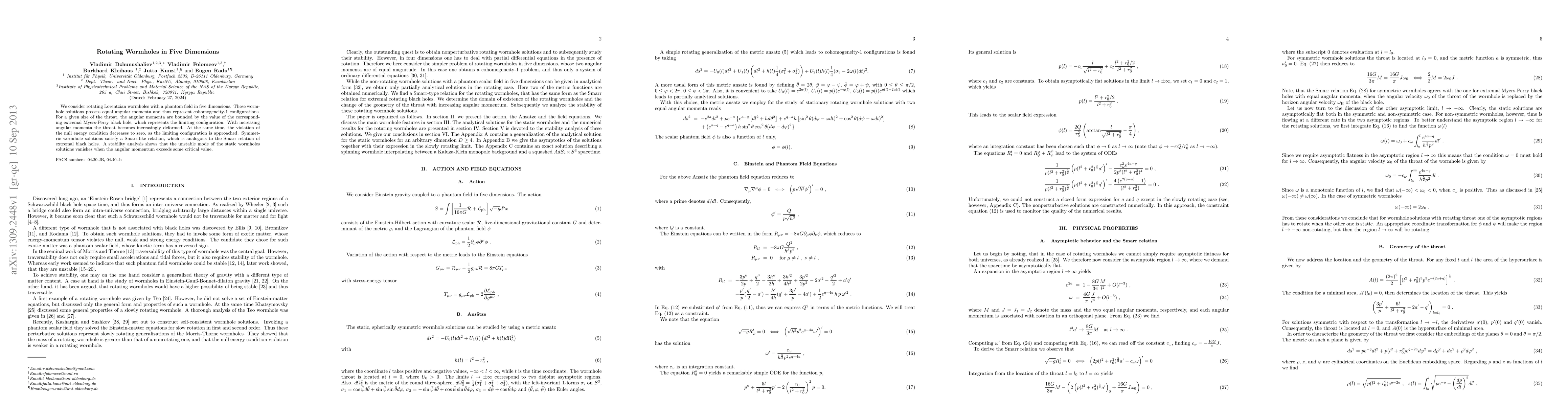 Researchers studied rotating wormholes in five dimensions, finding that increasing angular momentum deforms the throat but preserves a key stability relation, which disappears at a critical point.