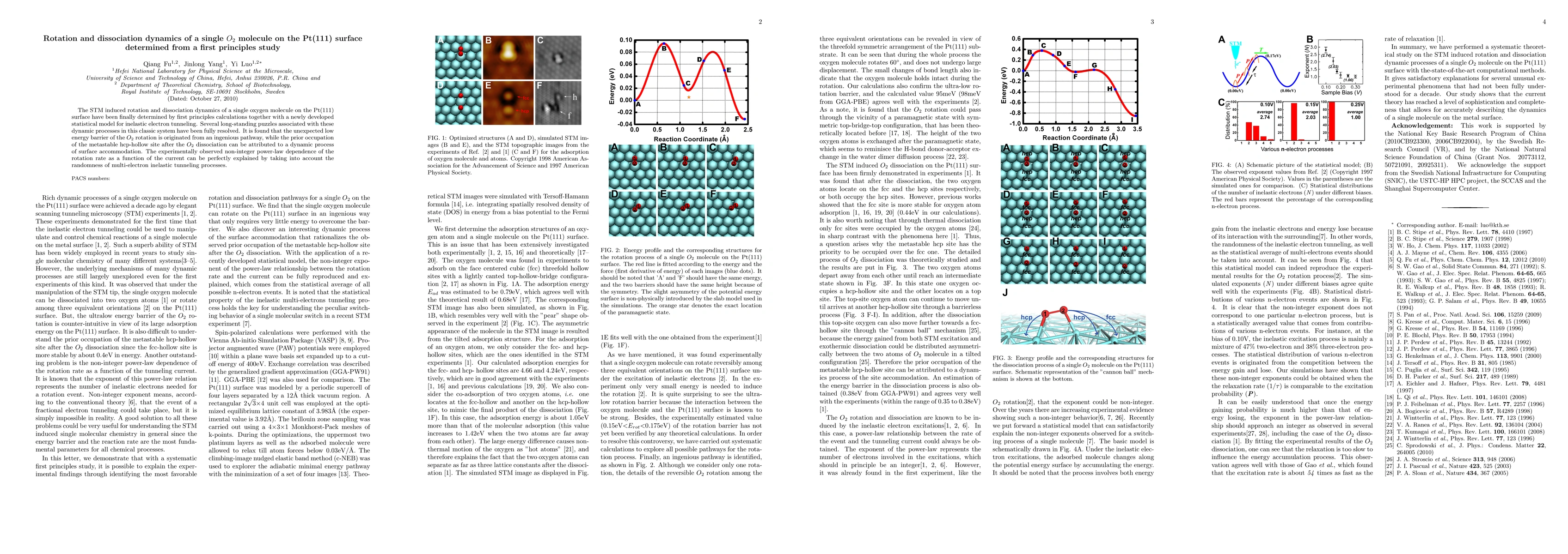 The STM induced rotation and dissociation dynamics of a single oxygen molecule on the Pt(111) surface have been finally determined by first principles calculations together with a newly developed statistical model for inelastic electron tunneling. Several long-standing puzzles associated with these dynamic processes in this classic system have been fully resolved. It is found that the unexpected low energy barrier of the O2 rotation is originated from an ingenious pathway, while the prior occupation of the metastable hcp-hollow site after the O2 dissociation can be attributed to a dynamic process of surface accommodation. The experimentally observed non-integer power-law dependence of the rotation rate as a function of the current can be perfectly explained by taking into account the randomness of multi-electron inelastic tunneling processes.