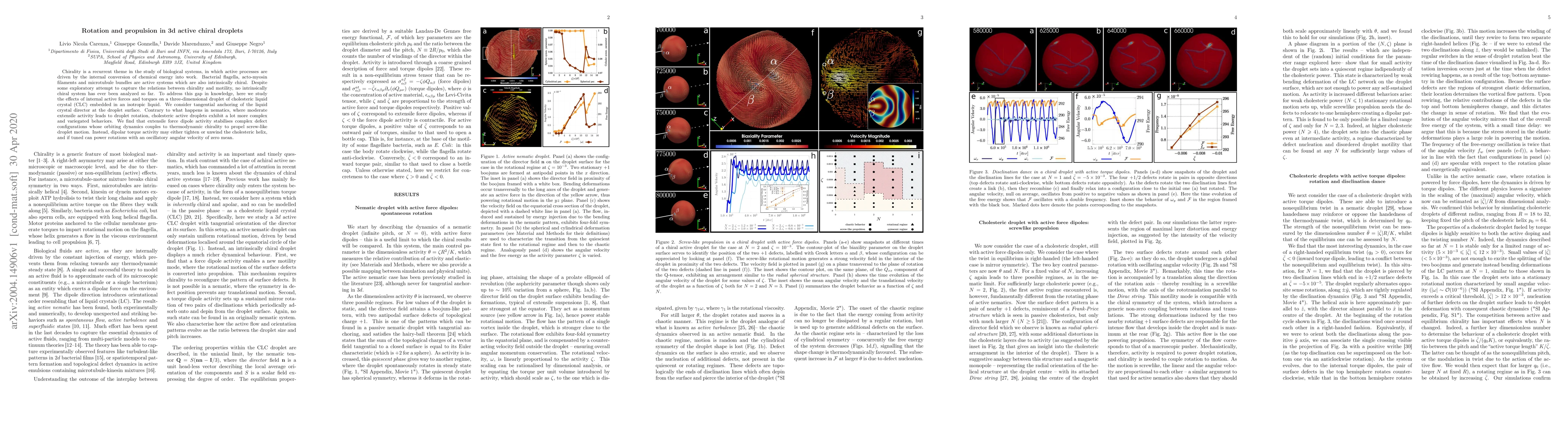 Chirality is a recurrent theme in the study of biological systems, in which active processes are driven by the internal conversion of chemical energy into work. Bacterial flagella, acto-myosin filaments and microtubule bundles are active systems which are also intrinsically chiral. Despite some exploratory attempt to capture the relations between chirality and motility, no intrinsically chiral system has ever been analyzed so far. To address this gap in knowledge, here we study the effects of internal active forces and torques on a three-dimensional droplet of cholesteric liquid crystal (CLC) embedded in an isotropic liquid. We consider tangential anchoring of the liquid crystal director at the droplet surface. Contrary to what happens in nematics, where moderate extensile activity leads to droplet rotation, cholesteric active droplets exhibit a lot more complex and variegated behaviors. We find that extensile force dipole activity stabilises complex defect configurations whose orbiting dynamics couples to thermodynamic chirality to propel screw-like droplet motion. Instead, dipolar torque activity may either tighten or unwind the cholesteric helix, and if tuned can power rotations with an oscillatory angular velocity of zero mean.