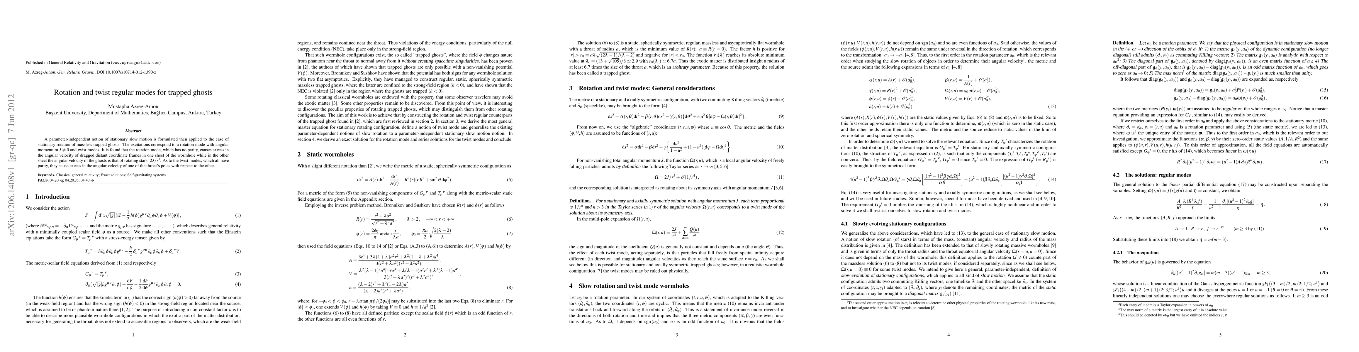 A parameter-independent notion of stationary slow motion is formulated then applied to the case of stationary rotation of massless trapped ghosts. The excitations correspond to a rotation mode with angular momentum $J\neq 0$ and twist modes. It is found that the rotation mode, which has no parity, causes excess in the angular velocity of dragged distant coordinate frames in one sheet of the wormhole while in the other sheet the angular velocity of the ghosts is that of rotating stars: $2J/r^3$. As to the twist modes, which all have parity, they cause excess in the angular velocity of one of the throat's poles with respect to the other.