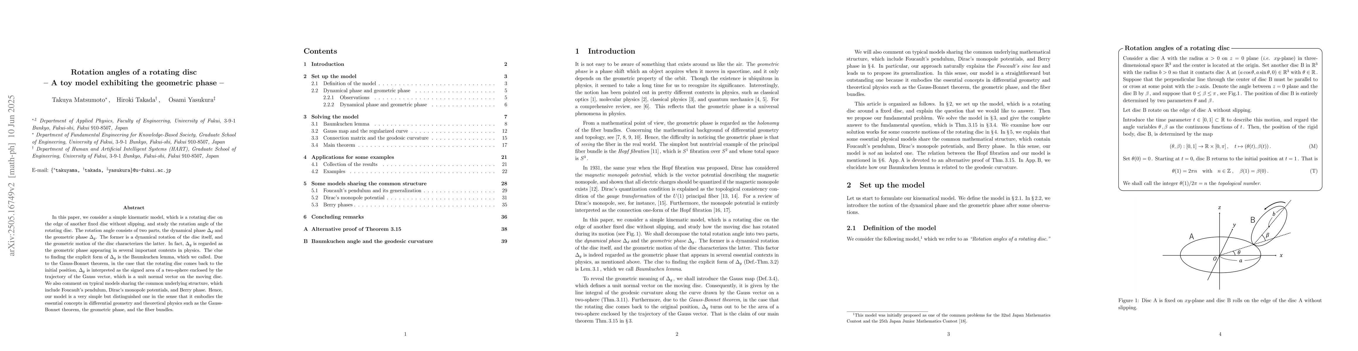 The research presents a novel, simplified approach to understanding geometric phases through a kinematic model of rotating discs, making it an accessible educational tool while contributing to theoretical physics.