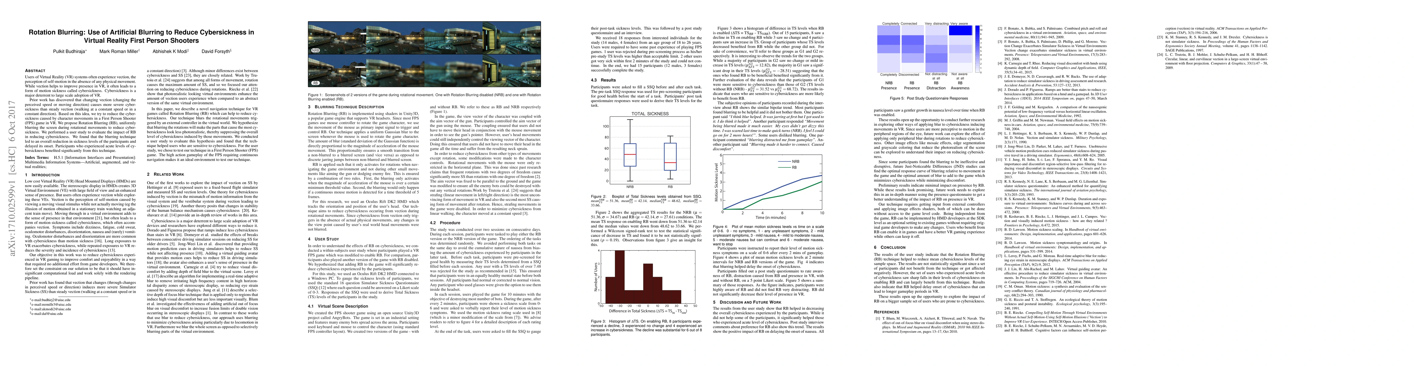 This paper proposes Rotation Blurring (RB) to mitigate cybersickness in VR FPS games by uniformly blurring the screen during rotational movements. The study found that RB significantly reduces sickness levels and delays its onset, particularly benefiting those with acute cybersickness.