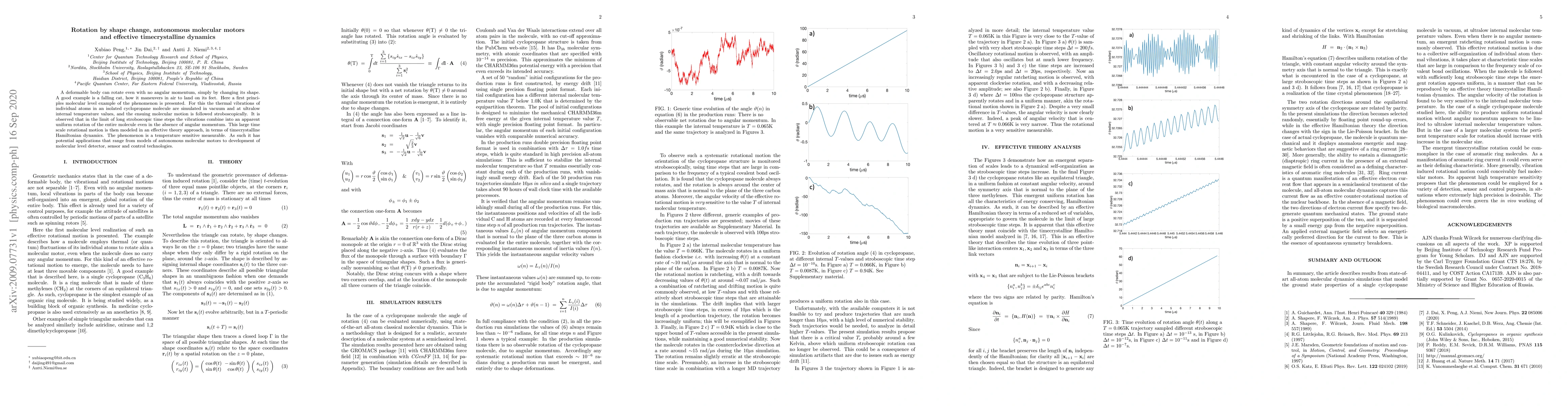 A deformable body can rotate even with no angular momentum, simply by changing its shape. A good example is a falling cat, how it maneuvers in air to land on its feet. Here a first principles molecular level example of the phenomenon is presented. For this the thermal vibrations of individual atoms in an isolated cyclopropane molecule are simulated in vacuum and at ultralow internal temperature values, and the ensuing molecular motion is followed stroboscopically. It is observed that in the limit of long stroboscopic time steps the vibrations combine into an apparent uniform rotation of the entire molecule even in the absence of angular momentum. This large time scale rotational motion is then modeled in an effective theory approach, in terms of timecrystalline Hamiltonian dynamics. The phenomenon is a temperature sensitive measurable. As such it has potential applications that range from models of autonomous molecular motors to development of molecular level detector, sensor and control technologies.