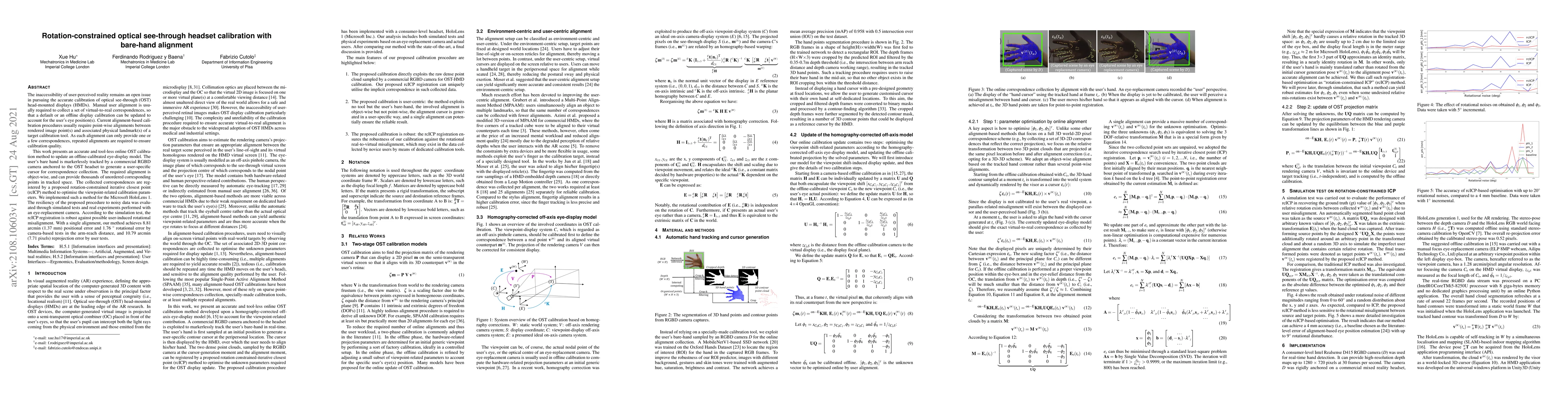 This paper presents a tool-less online calibration method for optical see-through head-mounted displays, using bare-hand alignment tracked by an RGBD camera. The method employs a rotation-constrained iterative closest point algorithm to optimize calibration parameters, achieving high accuracy with minimal user interaction.
