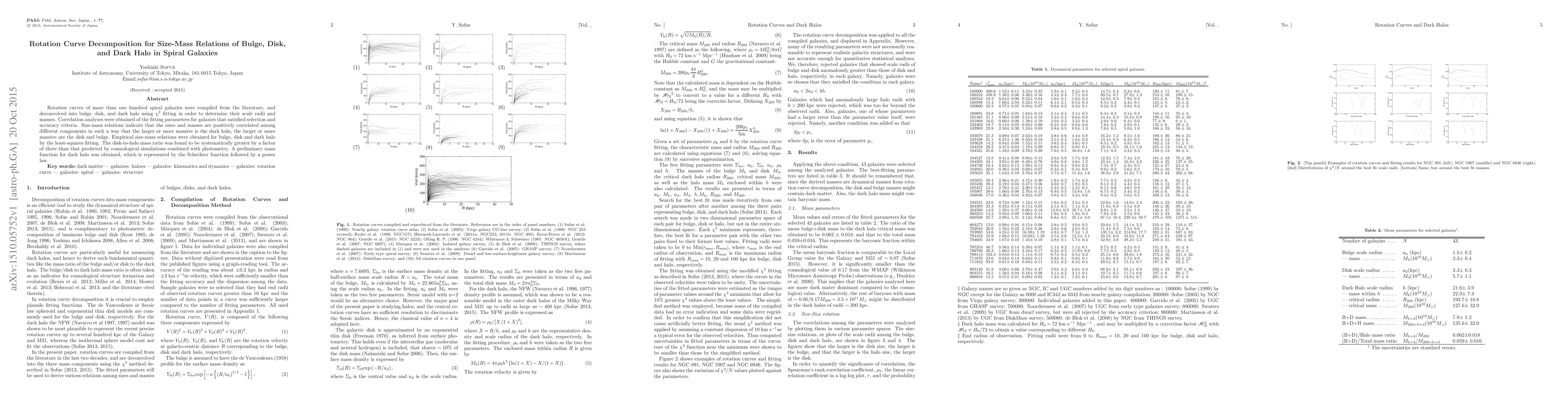 Rotation curves of more than one hundred spiral galaxies were compiled from the literature, and deconvolved into bulge, disk, and dark halo using $\chi^2$ fitting in order to determine their scale radii and masses. Correlation analyses were obtained of the fitting parameters for galaxies that satisfied selection and accuracy criteria. Size-mass relations indicate that the sizes and masses are positively correlated among different components in such a way that the larger or more massive is the dark halo, the larger or more massive are the disk and bulge. Empirical size-mass relations were obtained for bulge, disk and dark halo by the least-squares fitting. The disk-to-halo mass ratio was found to be systematically greater by a factor of three than that predicted by cosmological simulations combined with photometry. A preliminary mass function for dark halo was obtained, which is represented by the Schechter function followed by a power law.