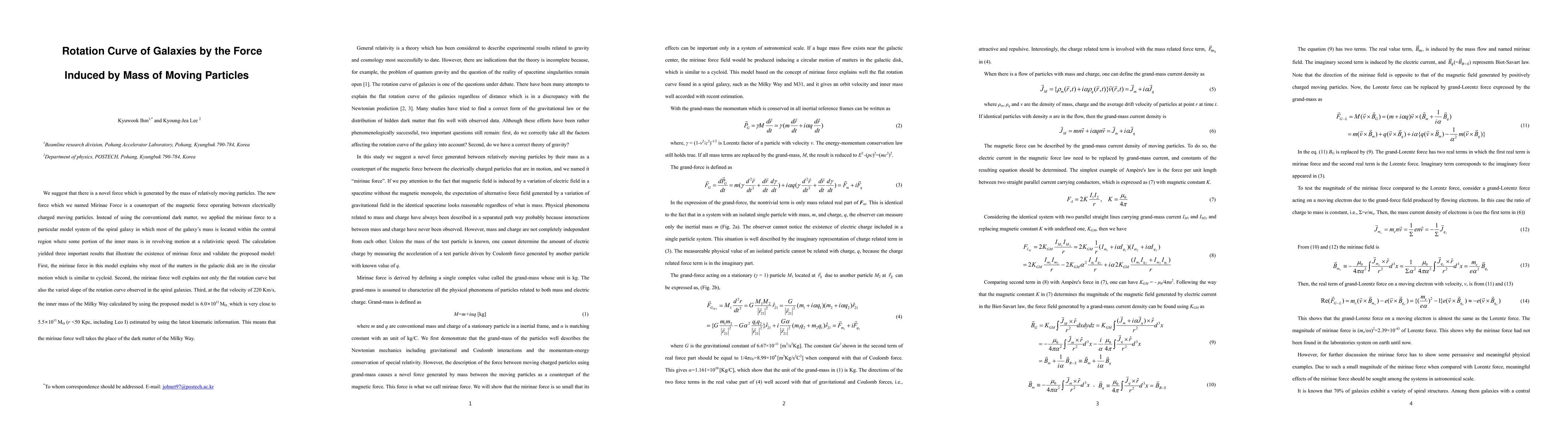 We suggest that there is a novel force which is generated by the mass of relatively moving particles. The new force which we named Mirinae Force is a counterpart of the magnetic force operating between electrically charged moving particles. Instead of using the conventional dark matter, we applied the mirinae force to a particular model system of the spiral galaxy in which most of the galaxy's mass is located within the central region where some portion of the inner mass is in revolving motion at a relativistic speed. The calculation yielded three important results that illustrate the existence of mirinae force and validate the proposed model: First, the mirinae force in this model explains why most of the matters in the galactic disk are in the circular motion which is similar to cycloid. Second, the mirinae force well explains not only the flat rotation curve but also the varied slope of the rotation curve observed in the spiral galaxies. Third, at the flat velocity of 220 Km/s, the inner mass of the Milky Way calculated by using the proposed model is 6.0\times10^11 M\odot, which is very close to 5.5\times10^11 M\odot (r <50 Kpc, including Leo I) estimated by using the latest kinematic information. This means that the mirinae force well takes the place of the dark matter of the Milky Way.