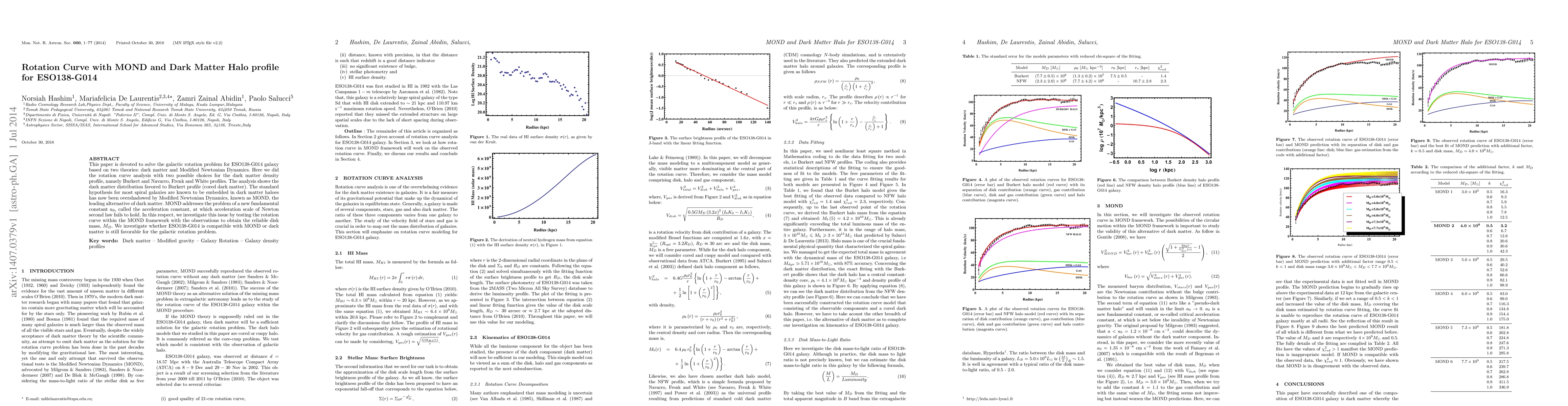 This paper analyzes the rotation curve of ESO138-G014 galaxy using both dark matter and Modified Newtonian Dynamics (MOND) theories, finding that the Burkert dark matter profile best fits the observations. It investigates whether MOND or dark matter provides a more reliable explanation for the galaxy's rotation.