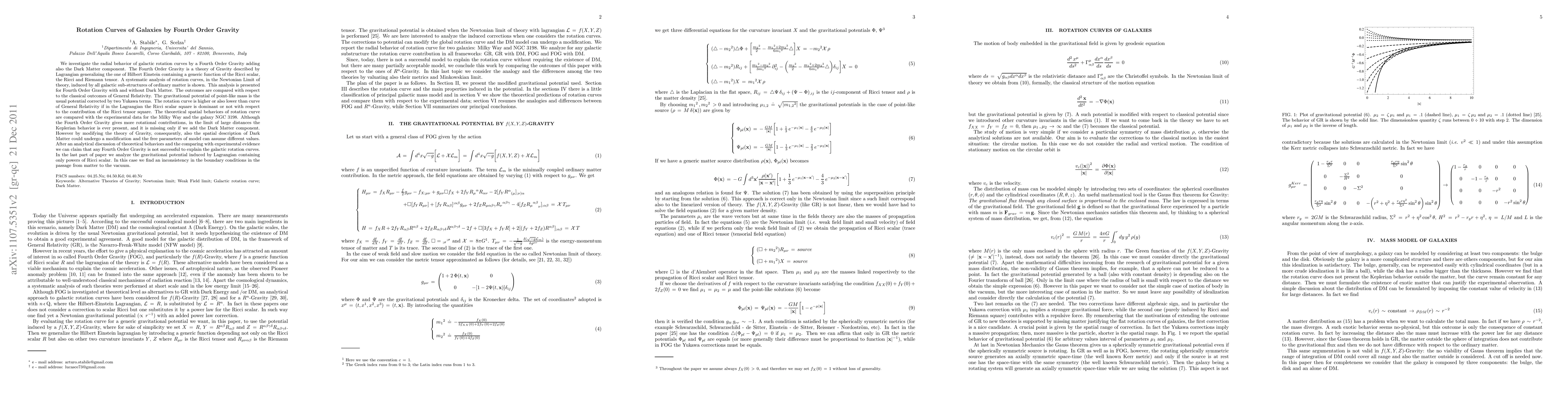 The paper presents a comprehensive analysis of galactic rotation curves using a generic function of Ricci scalar, Ricci, and Riemann tensors in Fourth Order Gravity, comparing it with GR, GR+DM, and FOG+DM.