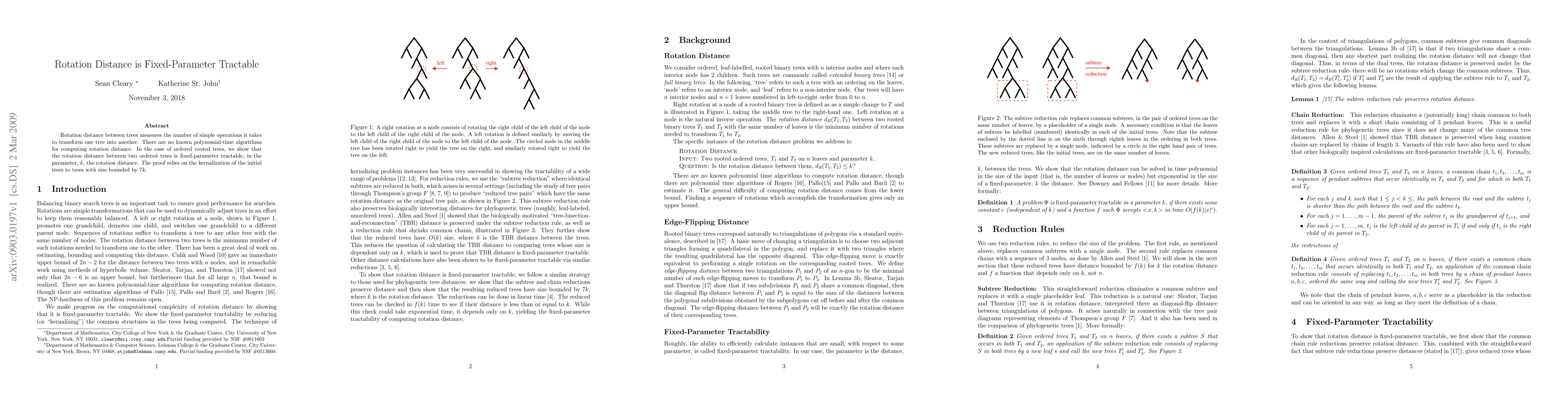 Summary: The paper demonstrates that computing the rotation distance between two ordered rooted trees is fixed-parameter tractable when parameterized by the rotation distance, k, using a kernelization technique that reduces the size of the trees to 7k. No polynomial-time algorithm for this computation is known.