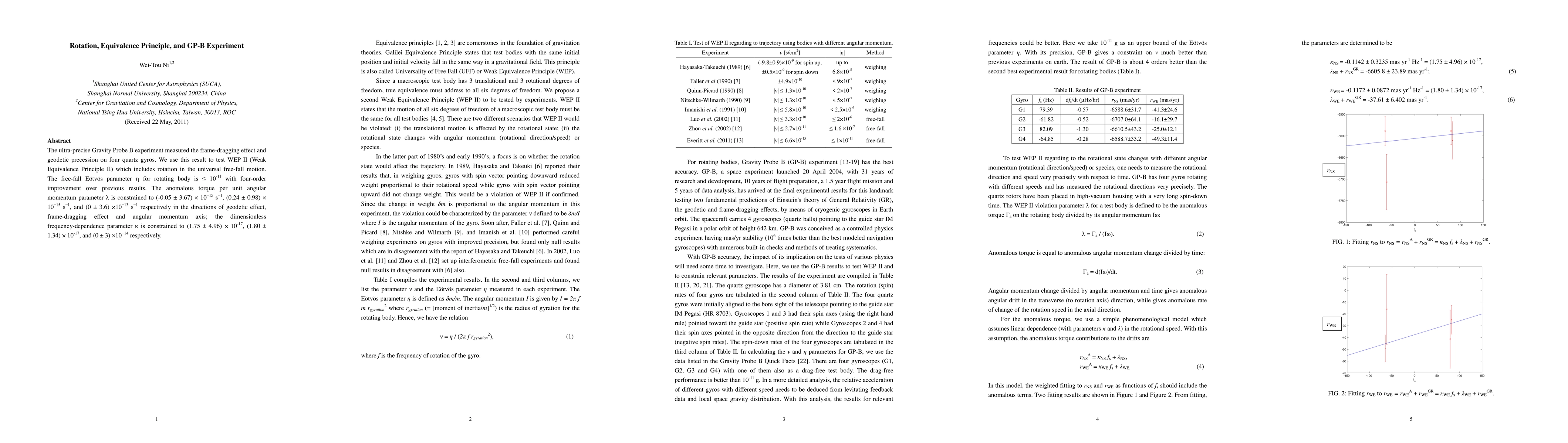 The Gravity Probe B experiment measured frame-dragging and geodetic precession, testing the Weak Equivalence Principle II (WEP II) for rotating bodies, achieving a four-order improvement in the free-fall Eötvös parameter. The study constrains anomalous torque and frequency-dependence parameters, providing significant constraints on deviations from WEP II.