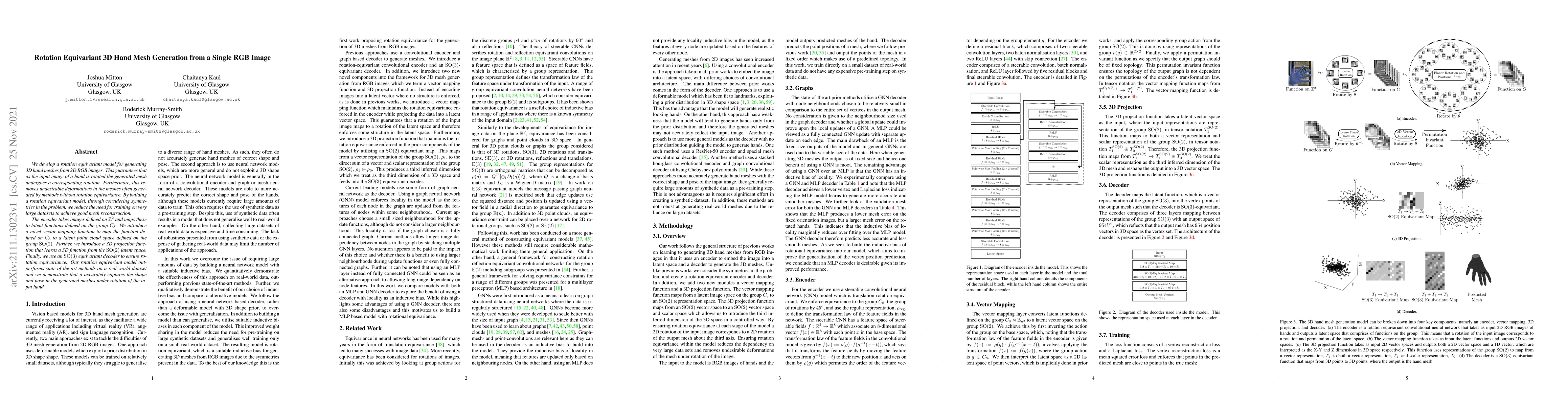 We develop a rotation equivariant model for generating 3D hand meshes from 2D RGB images. This guarantees that as the input image of a hand is rotated the generated mesh undergoes a corresponding rotation. Furthermore, this removes undesirable deformations in the meshes often generated by methods without rotation equivariance. By building a rotation equivariant model, through considering symmetries in the problem, we reduce the need for training on very large datasets to achieve good mesh reconstruction. The encoder takes images defined on $\mathbb{Z}^{2}$ and maps these to latent functions defined on the group $C_{8}$. We introduce a novel vector mapping function to map the function defined on $C_{8}$ to a latent point cloud space defined on the group $\mathrm{SO}(2)$. Further, we introduce a 3D projection function that learns a 3D function from the $\mathrm{SO}(2)$ latent space. Finally, we use an $\mathrm{SO}(3)$ equivariant decoder to ensure rotation equivariance. Our rotation equivariant model outperforms state-of-the-art methods on a real-world dataset and we demonstrate that it accurately captures the shape and pose in the generated meshes under rotation of the input hand.