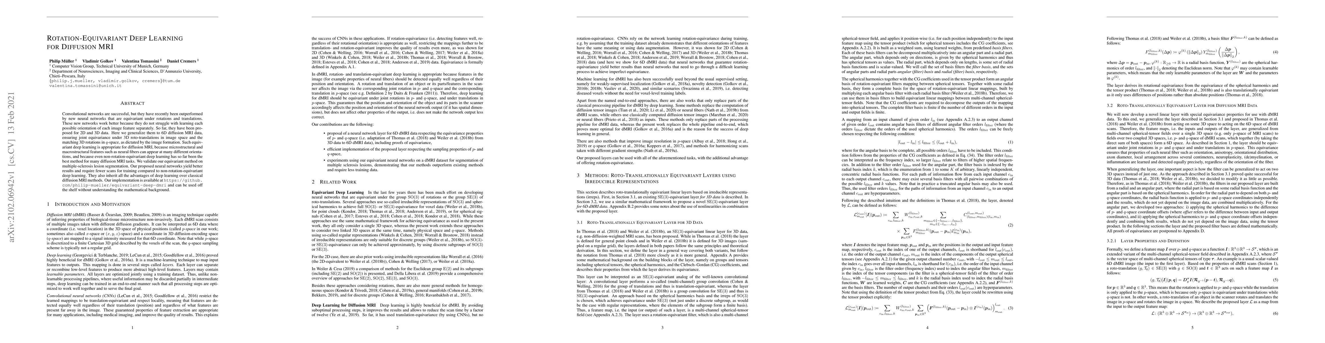 This paper proposes rotation-equivariant deep learning networks for 6D diffusion MRI data, achieving better performance in multiple-sclerosis lesion segmentation compared to traditional methods. The equivariant networks require fewer training scans and inherit the advantages of deep learning over classical methods.