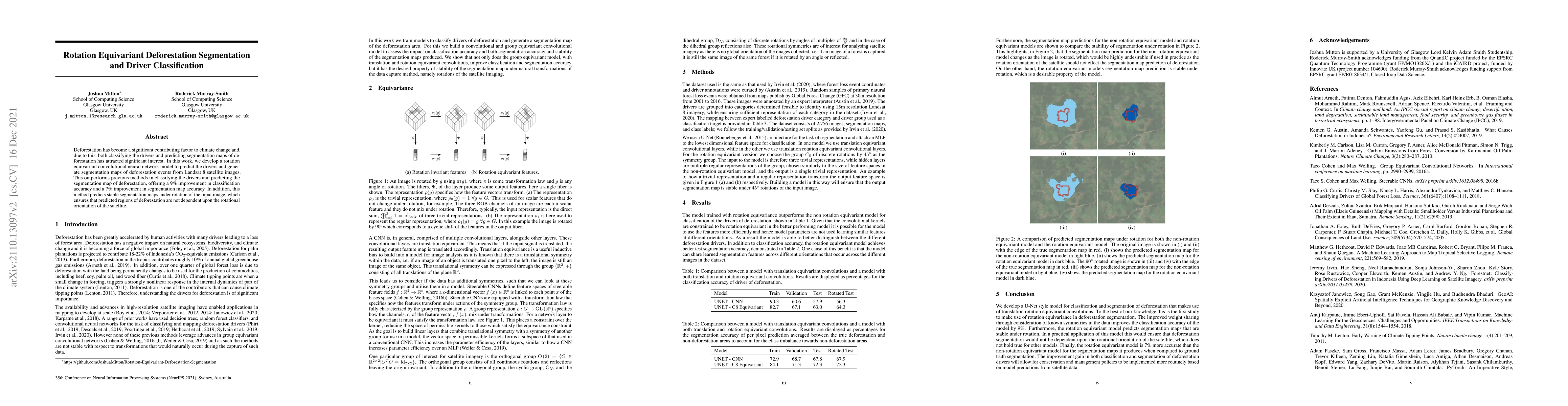 Deforestation has become a significant contributing factor to climate change and, due to this, both classifying the drivers and predicting segmentation maps of deforestation has attracted significant interest. In this work, we develop a rotation equivariant convolutional neural network model to predict the drivers and generate segmentation maps of deforestation events from Landsat 8 satellite images. This outperforms previous methods in classifying the drivers and predicting the segmentation map of deforestation, offering a 9% improvement in classification accuracy and a 7% improvement in segmentation map accuracy. In addition, this method predicts stable segmentation maps under rotation of the input image, which ensures that predicted regions of deforestation are not dependent upon the rotational orientation of the satellite.