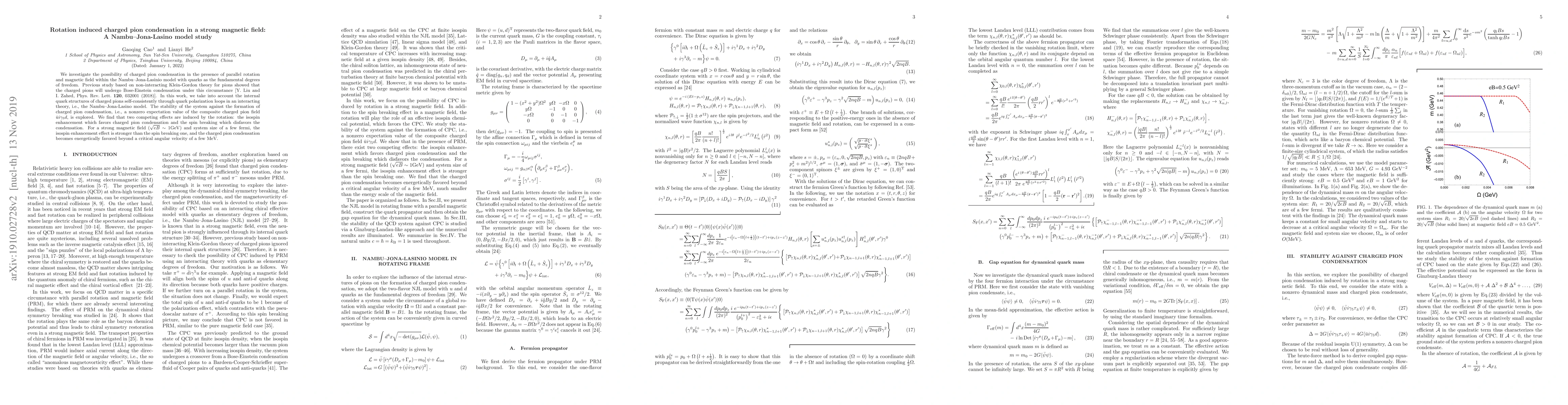 This study explores charged pion condensation in the presence of parallel rotation and a strong magnetic field using the Nambu-Jona-Lasinio model. The research finds that while rotation induces competing effects, the isospin enhancement favors pion condensation, making it energetically favorable at high angular velocities and strong magnetic fields.