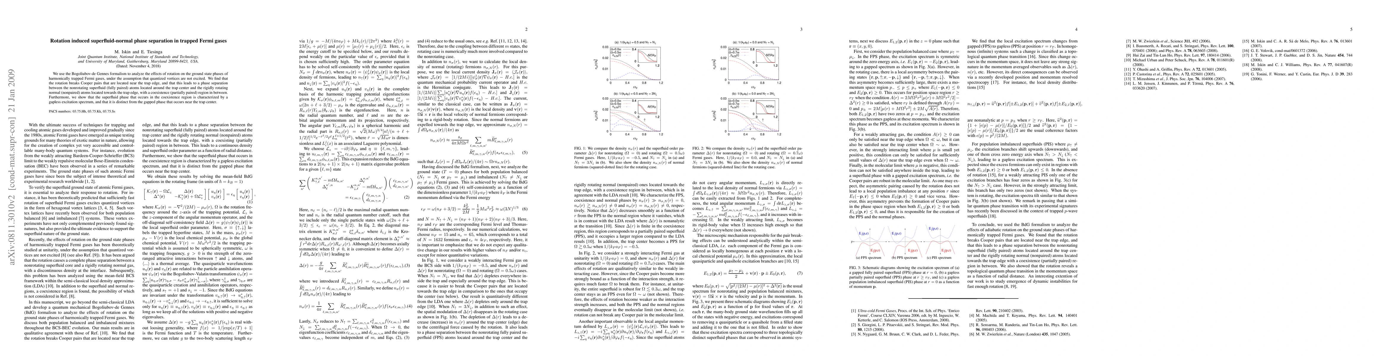 This study explores how rotation affects the ground state phases of trapped Fermi gases, revealing a superfluid-normal phase separation due to the breaking of Cooper pairs near the trap edge. The research identifies a coexistence region with a gapless excitation spectrum, distinct from the fully paired superfluid phase at the center.