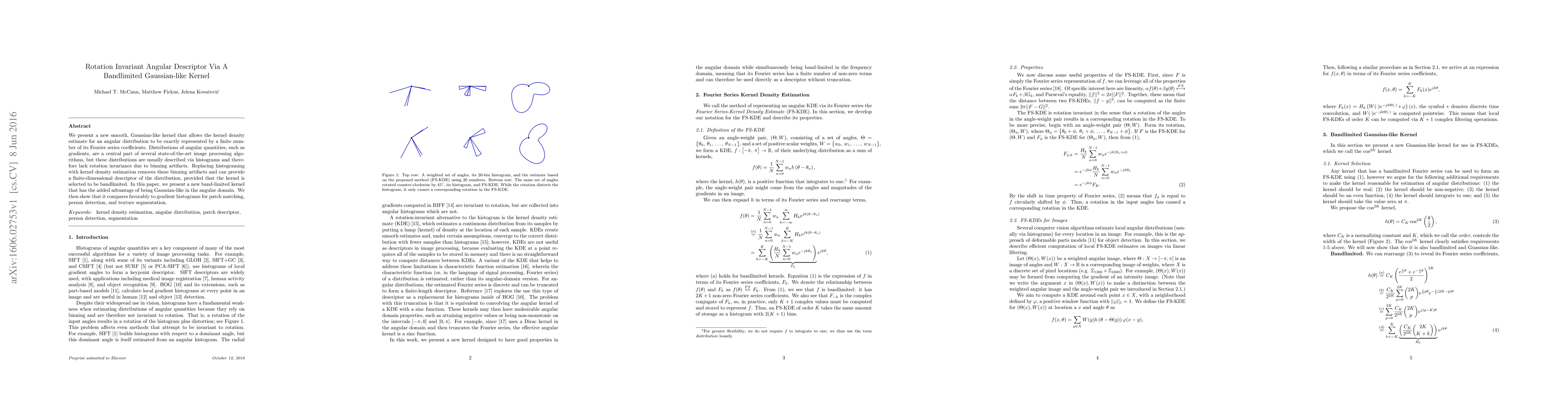 We present a new smooth, Gaussian-like kernel that allows the kernel density estimate for an angular distribution to be exactly represented by a finite number of its Fourier series coefficients. Distributions of angular quantities, such as gradients, are a central part of several state-of-the-art image processing algorithms, but these distributions are usually described via histograms and therefore lack rotation invariance due to binning artifacts. Replacing histograming with kernel density estimation removes these binning artifacts and can provide a finite-dimensional descriptor of the distribution, provided that the kernel is selected to be bandlimited. In this paper, we present a new band-limited kernel that has the added advantage of being Gaussian-like in the angular domain. We then show that it compares favorably to gradient histograms for patch matching, person detection, and texture segmentation.