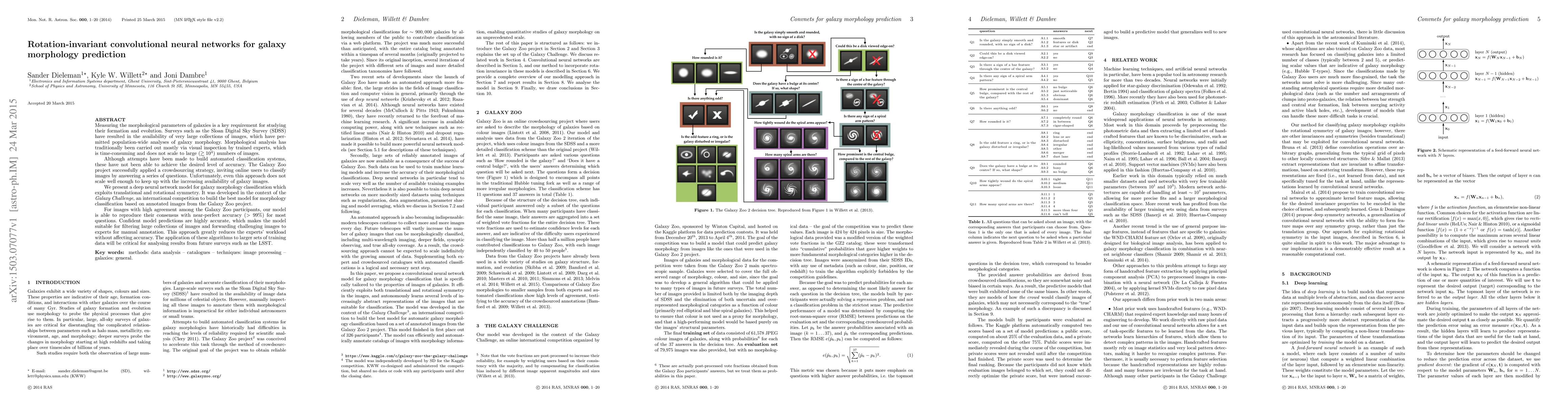 Measuring the morphological parameters of galaxies is a key requirement for studying their formation and evolution. Surveys such as the Sloan Digital Sky Survey (SDSS) have resulted in the availability of very large collections of images, which have permitted population-wide analyses of galaxy morphology. Morphological analysis has traditionally been carried out mostly via visual inspection by trained experts, which is time-consuming and does not scale to large ($\gtrsim10^4$) numbers of images. Although attempts have been made to build automated classification systems, these have not been able to achieve the desired level of accuracy. The Galaxy Zoo project successfully applied a crowdsourcing strategy, inviting online users to classify images by answering a series of questions. Unfortunately, even this approach does not scale well enough to keep up with the increasing availability of galaxy images. We present a deep neural network model for galaxy morphology classification which exploits translational and rotational symmetry. It was developed in the context of the Galaxy Challenge, an international competition to build the best model for morphology classification based on annotated images from the Galaxy Zoo project. For images with high agreement among the Galaxy Zoo participants, our model is able to reproduce their consensus with near-perfect accuracy ($> 99\%$) for most questions. Confident model predictions are highly accurate, which makes the model suitable for filtering large collections of images and forwarding challenging images to experts for manual annotation. This approach greatly reduces the experts' workload without affecting accuracy. The application of these algorithms to larger sets of training data will be critical for analysing results from future surveys such as the LSST.
