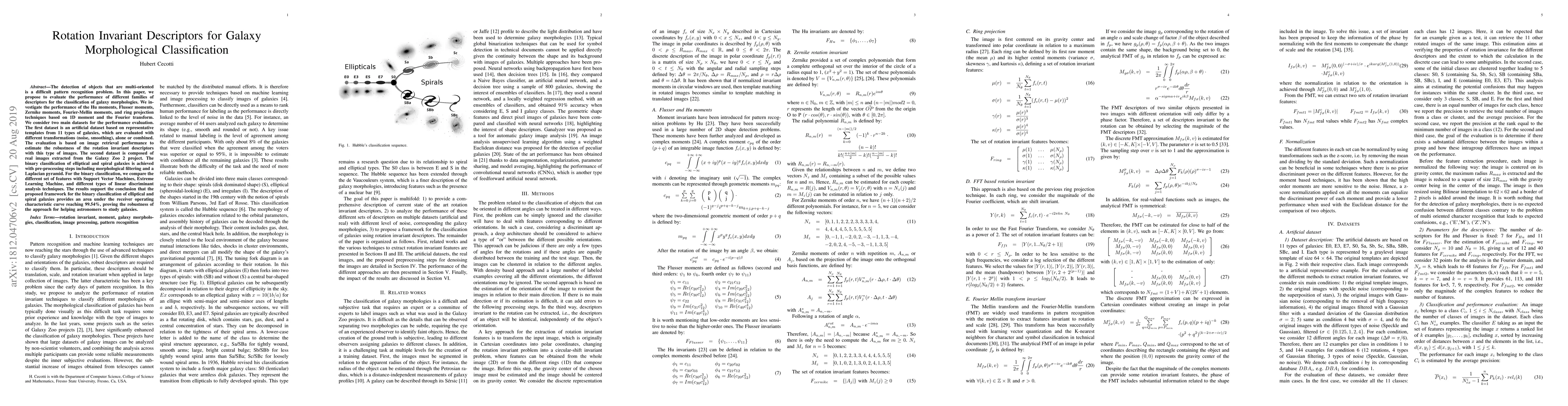The detection of objects that are multi-oriented is a difficult pattern recognition problem. In this paper, we propose to evaluate the performance of different families of descriptors for the classification of galaxy morphologies. We investigate the performance of the Hu moments, Flusser moments, Zernike moments, Fourier-Mellin moments, and ring projection techniques based on 1D moment and the Fourier transform. We consider two main datasets for the performance evaluation. The first dataset is an artificial dataset based on representative templates from 11 types of galaxies, which are evaluated with different transformations (noise, smoothing), alone or combined. The evaluation is based on image retrieval performance to estimate the robustness of the rotation invariant descriptors with this type of images. The second dataset is composed of real images extracted from the Galaxy Zoo 2 project. The binary classification of elliptical and spiral galaxies is achieved with pre-processing steps including morphological filtering and a Laplacian pyramid. For the binary classification, we compare the different set of features with Support Vector Machines (SVM), Extreme Learning Machine, and different types of linear discriminant analysis techniques. The results support the conclusion that the proposed framework for the binary classification of elliptical and spiral galaxies provides an area under the ROC curve reaching 99.54%, proving the robustness of the approach for helping astronomers to study galaxies.