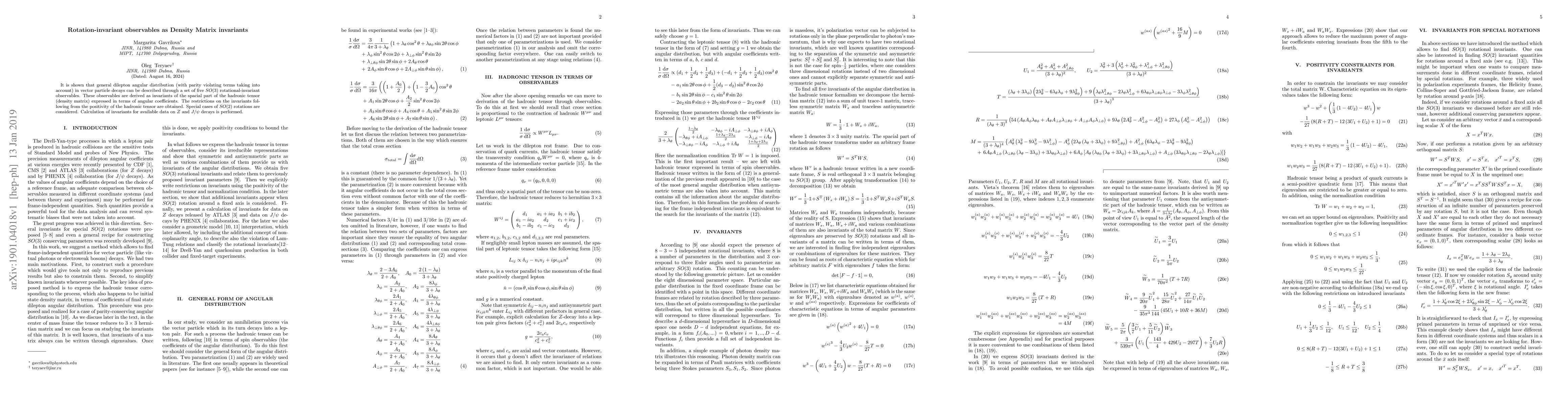This research derives five rotation-invariant observables from the spatial part of the hadronic tensor, applicable to dilepton angular distributions in vector particle decays. It also calculates these invariants for Z and J/ψ decays, subject to hadronic tensor positivity restrictions.