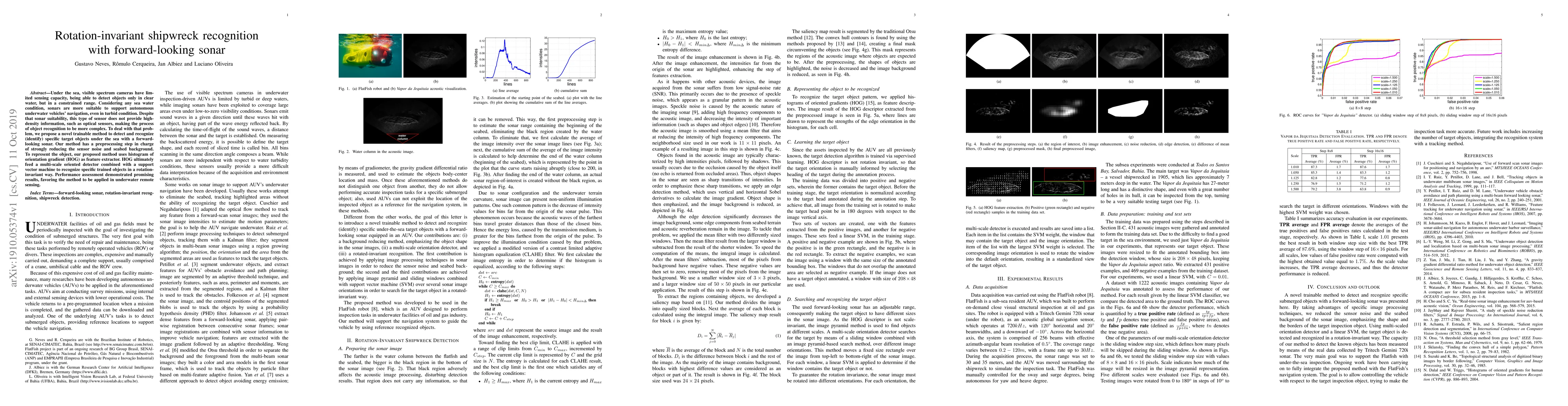 This paper proposes a novel method for detecting and recognizing specific underwater objects using forward-looking sonar, addressing the challenges of sonar's low-density information. The method employs preprocessing to reduce noise and uses histogram of orientation gradient (HOG) features with a multi-scale detector and support vector machine for rotation-invariant object recognition, showing promising results for underwater navigation.
