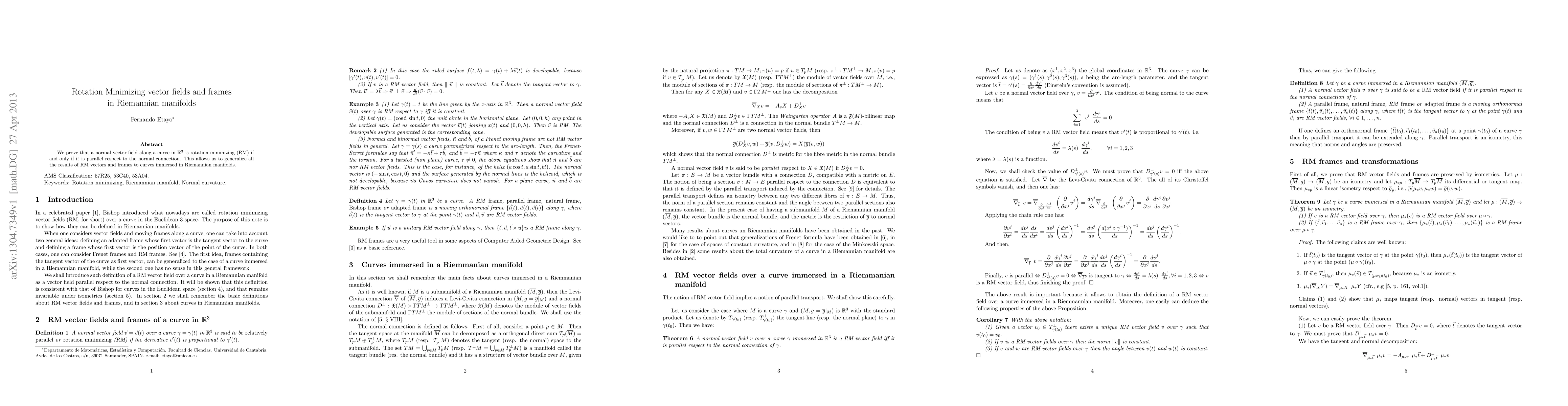 Summary: The paper proves that a normal vector field along a curve in R3 is rotation minimizing if and only if it is parallel with respect to the normal connection. This result generalizes the concept of rotation minimizing vectors and frames to curves in Riemannian manifolds.