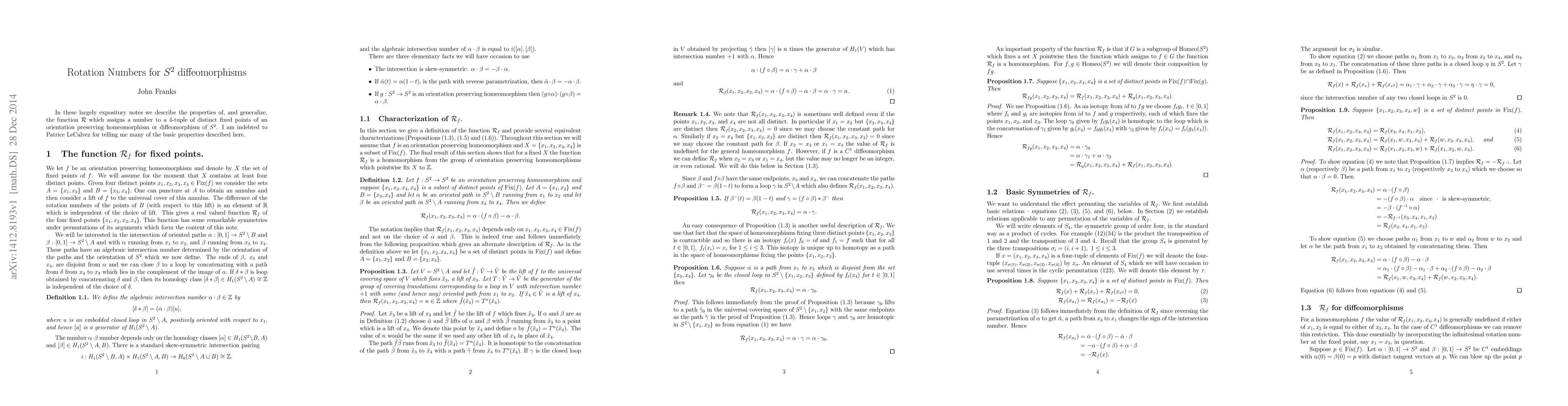 These largely expository notes describe the properties of the function ${\cal R}$ which assigns a number to a $4$-tuple of distinct fixed points of an orientation preserving homeomorphism or diffeomorphism of $S^2$.