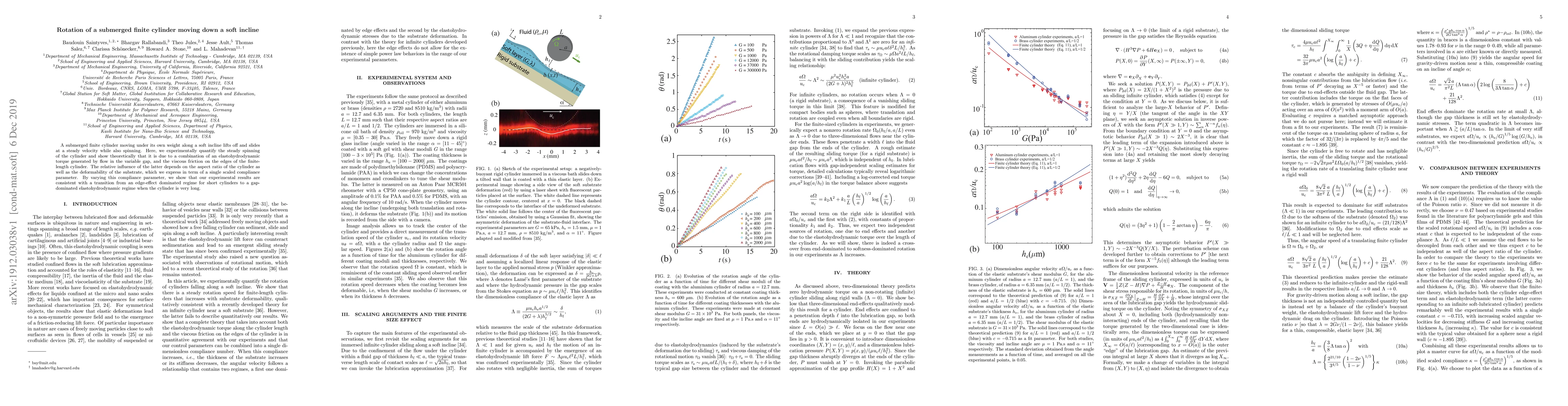 This study experimentally and theoretically investigates the rotation of a submerged finite cylinder sliding down a soft incline, demonstrating that steady spinning results from elastohydrodynamic torque and viscous friction. The transition from edge-effect dominance to elastohydrodynamic dominance is shown to depend on cylinder aspect ratio and substrate deformability, quantified by a scaled compliance parameter.