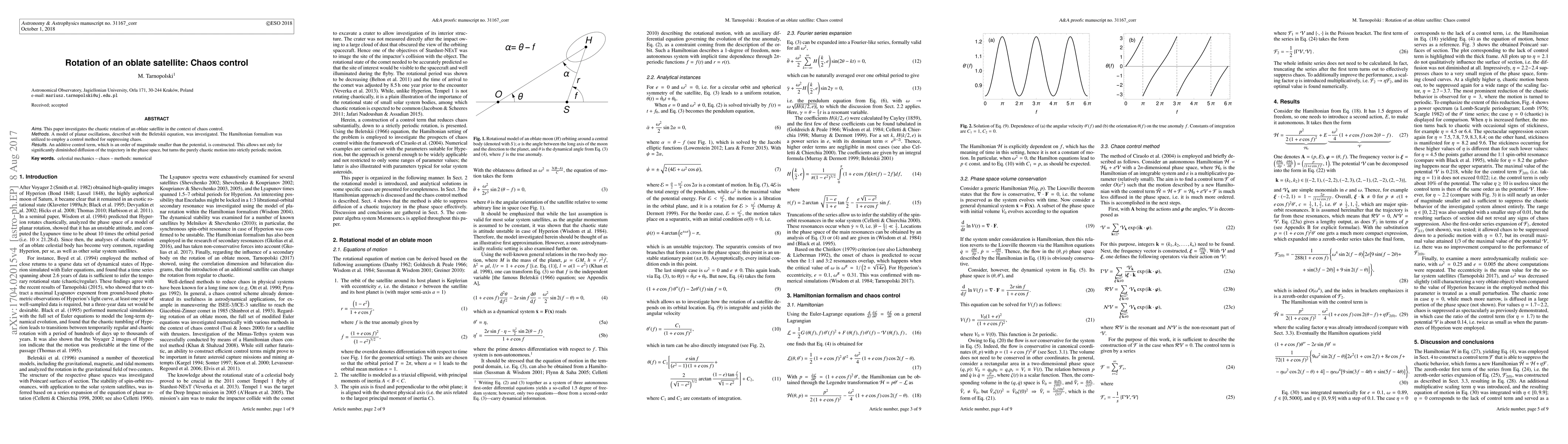 Aims. This paper investigates the chaotic rotation of an oblate satellite in the context of chaos control. Methods. A model of planar oscillations, described with the Beletskii equation, was investigated. The Hamiltonian formalism was utilized to employ a control method for suppressing chaos. Results. An additive control term, which is an order of magnitude smaller than the potential, is constructed. This allows not only for significantly diminished diffusion of the trajectory in the phase space, but turns the purely chaotic motion into strictly periodic motion.