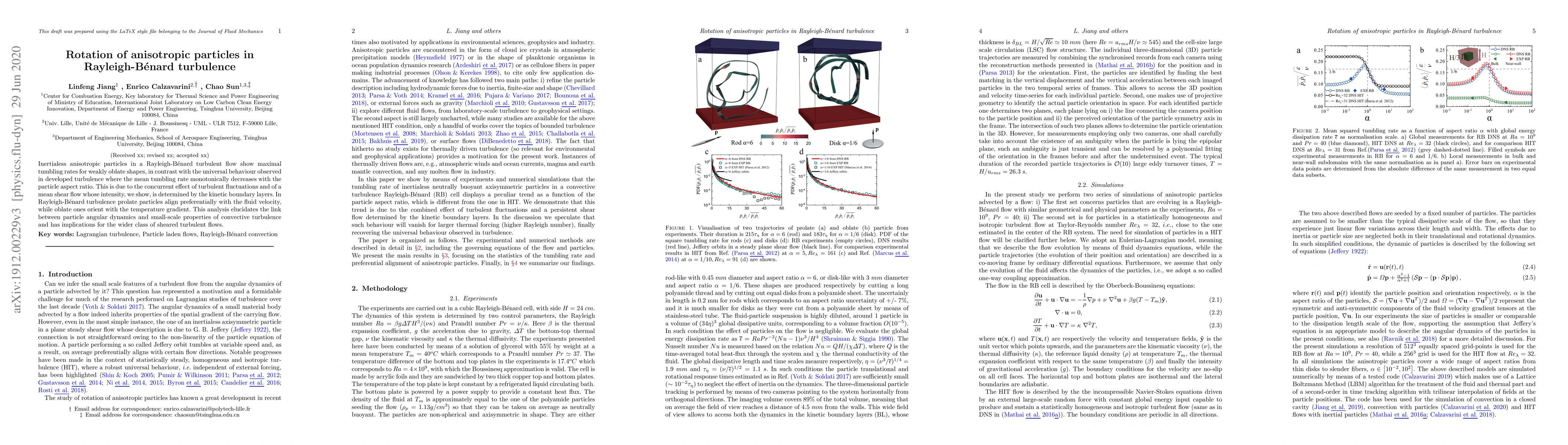 This paper investigates the rotation of inertialess anisotropic particles in Rayleigh-Bénard turbulence, revealing that weakly oblate particles exhibit maximal tumbling rates due to the combined effect of turbulent fluctuations and mean shear flow. It highlights the distinct alignment behaviors of prolate and oblate particles, providing insights into the relationship between particle dynamics and the small-scale properties of convective turbulence.