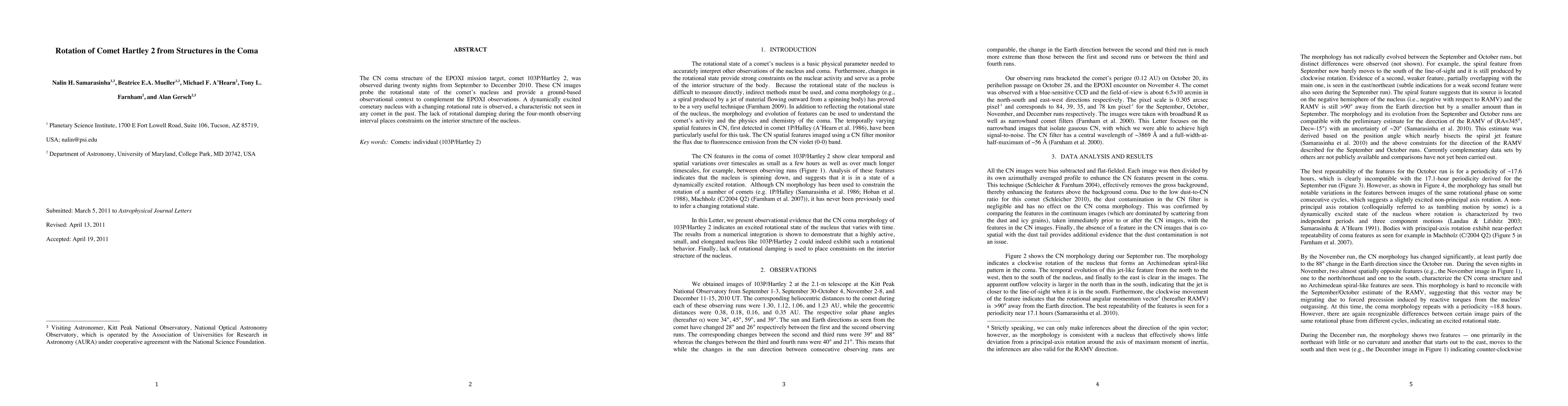 The CN coma structure of the EPOXI mission target, comet 103P/Hartley 2, was observed during twenty nights from September to December 2010. These CN images probe the rotational state of the comet's nucleus and provide a ground-based observational context to complement the EPOXI observations. A dynamically excited cometary nucleus with a changing rotational rate is observed, a characteristic not seen in any comet in the past. The lack of rotational damping during the four-month observing interval places constraints on the interior structure of the nucleus.