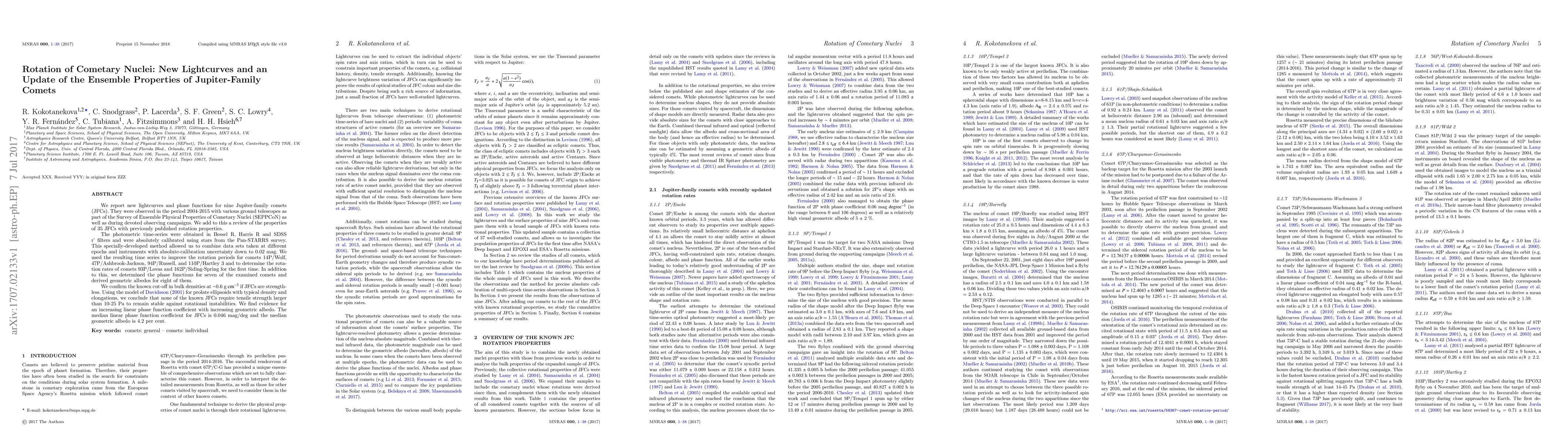 We report new lightcurves and phase functions for nine Jupiter-family comets (JFCs). They were observed in the period 2004-2015 with various ground telescopes as part of the Survey of Ensemble Physical Properties of Cometary Nuclei (SEPPCoN) as well as during devoted observing campaigns. We add to this a review of the properties of 35 JFCs with previously published rotation properties. The photometric time-series were obtained in Bessel R, Harris R and SDSS r' filters and were absolutely calibrated using stars from the Pan-STARRS survey. This specially-developed method allowed us to combine data sets taken at different epochs and instruments with absolute-calibration uncertainty down to 0.02 mag. We used the resulting time series to improve the rotation periods for comets 14P/Wolf, 47P/Ashbrook-Jackson, 94P/Russell, and 110P/Hartley 3 and to determine the rotation rates of comets 93P/Lovas and 162P/Siding-Spring for the first time. In addition to this, we determined the phase functions for seven of the examined comets and derived geometric albedos for eight of them. We confirm the known cut-off in bulk densities at $\sim$0.6 g $\mathrm{cm^{-3}}$ if JFCs are strengthless. Using the model of Davidsson (2001) for prolate ellipsoids with typical density and elongations, we conclude that none of the known JFCs require tensile strength larger than 10-25 Pa to remain stable against rotational instabilities. We find evidence for an increasing linear phase function coefficient with increasing geometric albedo. The median linear phase function coefficient for JFCs is 0.046 mag/deg and the median geometric albedo is 4.2 per cent.
