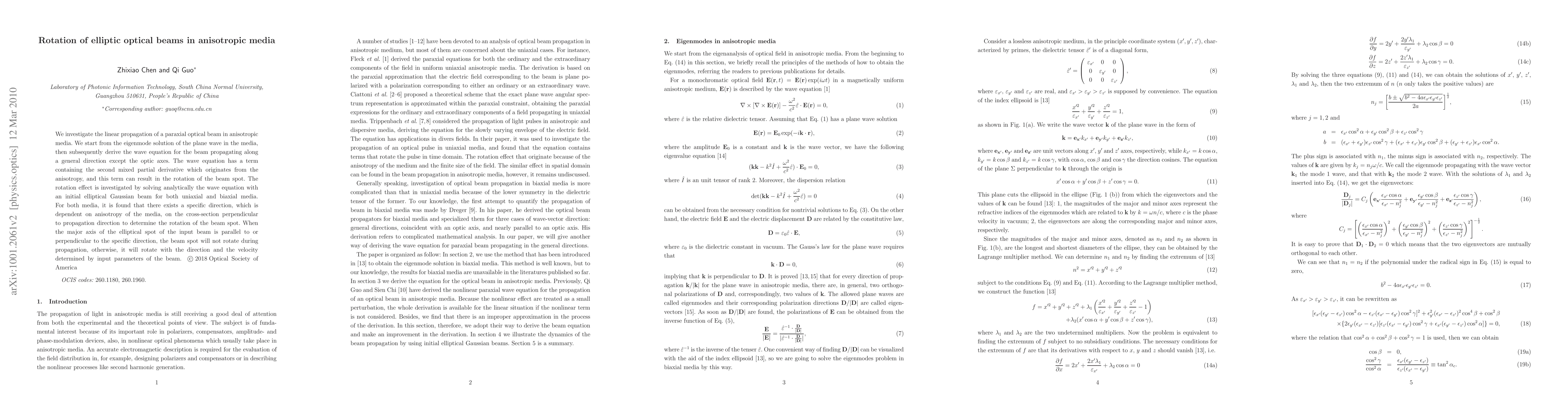 We investigate the linear propagation of a paraxial optical beam in anisotropic media. We start from the eigenmode solution of the plane wave in the media, then subsequently derive the wave equation for the beam propagating along a general direction except the optic axes. The wave equation has a term containing the second mixed partial derivative which originates from the anisotropy, and this term can result in the rotation of the beam spot. The rotation effect is investigated by solving analytically the wave equation with an initial elliptical Gaussian beam for both uniaxial and biaxial media. For both media, it is found that there exists a specific direction, which is dependent on anisotropy of the media, on the cross-section perpendicular to propagation direction to determine the rotation of the beam spot. When the major axis of the elliptical spot of the input beam is parallel to or perpendicular to the specific direction, the beam spot will not rotate during propagation, otherwise, it will rotate with the direction and the velocity determined by input parameters of the beam.