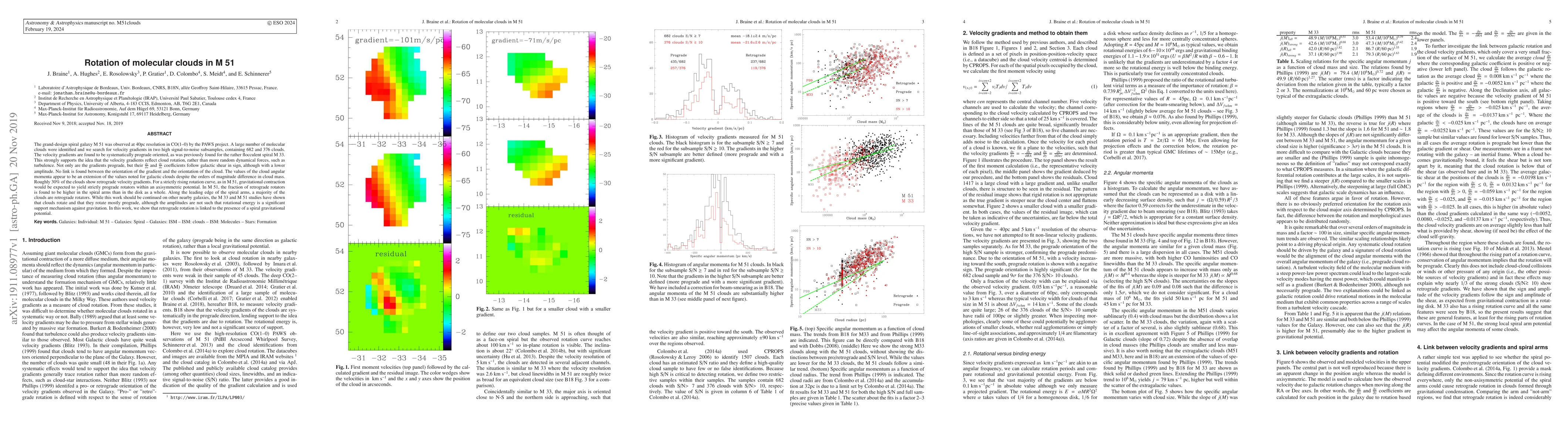 The grand-design spiral galaxy M~51 was observed at 40pc resolution in CO(1--0) by the PAWS project. A large number of molecular clouds were identified and we search for velocity gradients in two high signal-to-noise subsamples, containing 682 and 376 clouds. The velocity gradients are found to be systematically prograde oriented, as was previously found for the rather flocculent spiral M~33. This strongly supports the idea that the velocity gradients reflect cloud rotation, rather than more random dynamical forces, such as turbulence. Not only are the gradients prograde, but their $\frac{\partial v}{\partial x}$ and $\frac{\partial v}{\partial y}$ coefficients follow galactic shear in sign, although with a lower amplitude. No link is found between the orientation of the gradient and the orientation of the cloud. The values of the cloud angular momenta appear to be an extension of the values noted for galactic clouds despite the orders of magnitude difference in cloud mass. Roughly 30\% of the clouds show retrograde velocity gradients. For a strictly rising rotation curve, as in M~51, gravitational contraction would be expected to yield strictly prograde rotators within an axisymmetric potential. In M~51, the fraction of retrograde rotators is found to be higher in the spiral arms than in the disk as a whole. Along the leading edge of the spiral arms, a majority of the clouds are retrograde rotators. While this work should be continued on other nearby galaxies, the M~33 and M~51 studies have shown that clouds rotate and that they rotate mostly prograde, although the amplitudes are not such that rotational energy is a significant support mechanism against gravitation. In this work, we show that retrograde rotation is linked to the presence of a spiral gravitational potential.