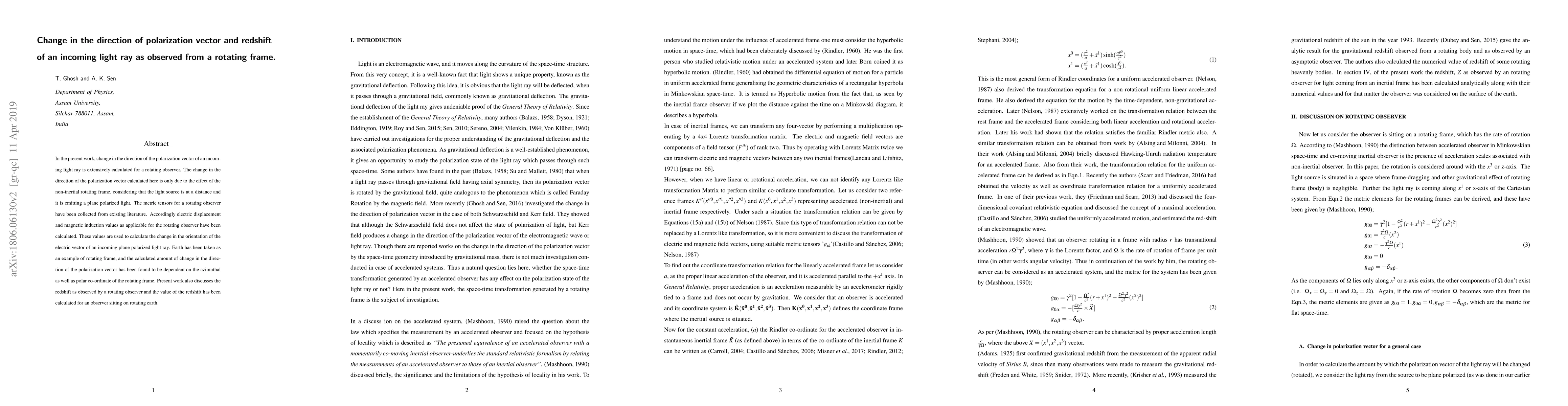 In the present work, rotation of the polarization vector of an electromagnetic wave is extensively calculated for a rotating observer, who can also be considered as a non-inertial accelerated observer. The rotation of the polarization vector calculated here is only due to the effect of the non-inertial frame, considering that the light source is at a distance and it is emitting a plane polarized light. Earth has been taken as an example of rotating frame and the amount of rotation of polarization vector is calculated where it is found that the amount of rotation of polarization vector depends on the azimuthal as well as a polar co-ordinate of the rotating frame. Present work also discusses the redshift caused by any rotating frame and the value of the redshift is calculated taking earth as an example of a rotating frame. The possibilities of experimentally verifying the predictions of present work are also discussed.