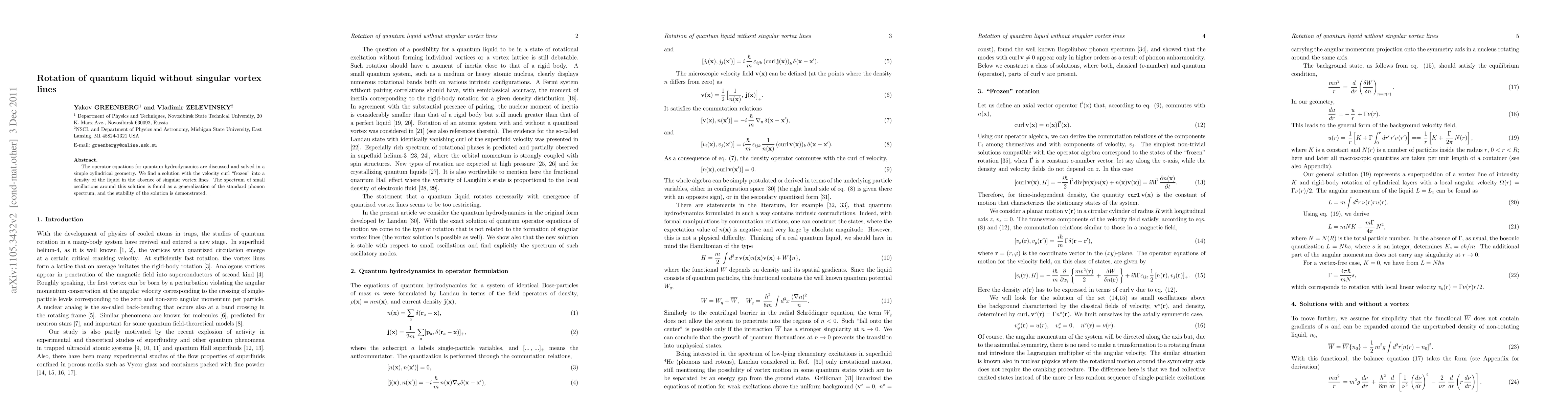 The operator equations for quantum hydrodynamics are discussed and solved in a simple cylindrical geometry. We find a solution with the velocity curl "frozen" into a density of the liquid in the absence of singular vortex lines. The spectrum of small oscillations around this solution is found as a generalization of the standard phonon spectrum, and the stability of the solution is demonstrated.