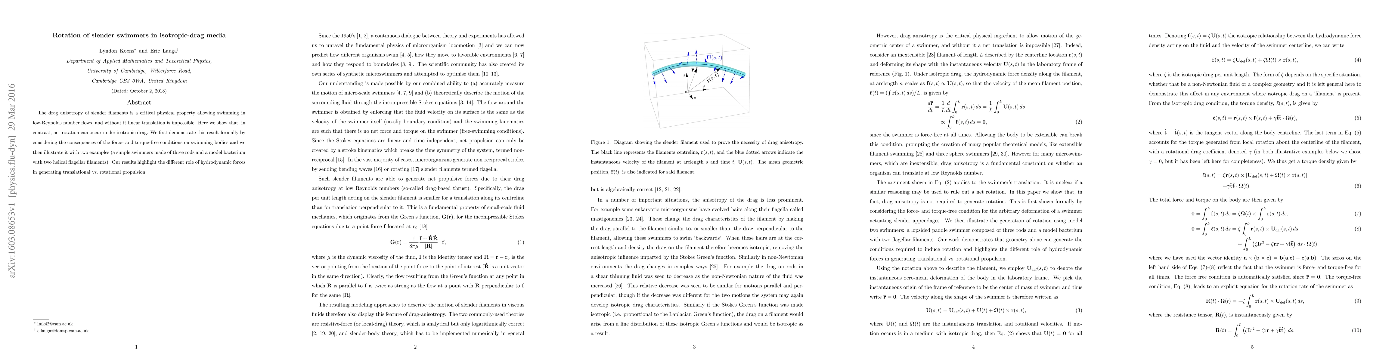 The drag anisotropy of slender filaments is a critical physical property allowing swimming in low-Reynolds number flows, and without it linear translation is impossible. Here we show that, in contrast, net rotation can occur under isotropic drag. We first demonstrate this result formally by considering the consequences of the force- and torque-free conditions on swimming bodies and we then illustrate it with two examples (a simple swimmers made of three rods and a model bacterium with two helical flagellar filaments). Our results highlight the different role of hydrodynamic forces in generating translational vs.~rotational propulsion.