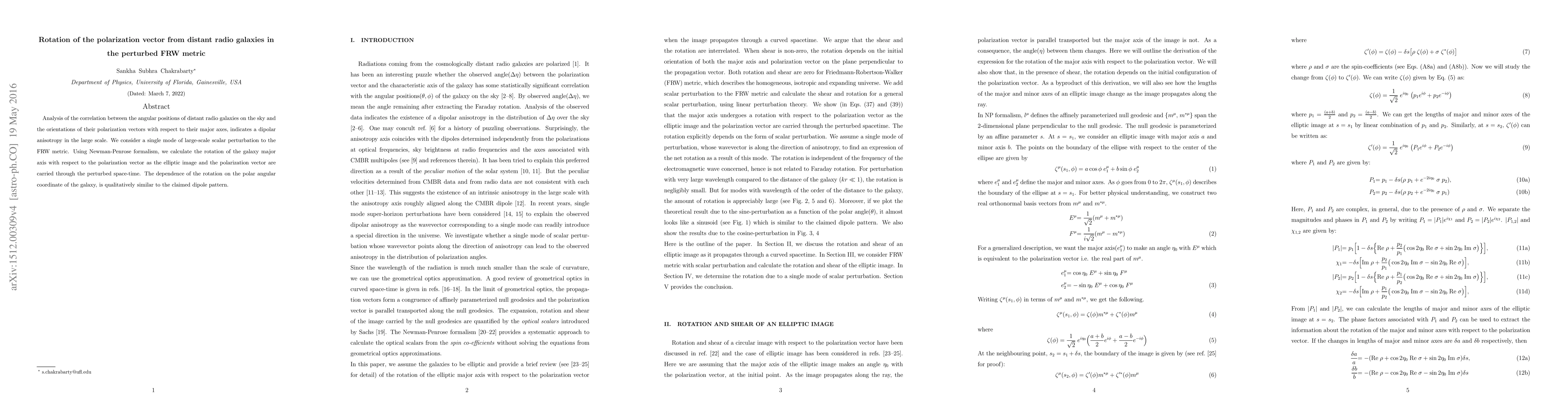 Analysis of the correlation between the angular positions of distant radio galaxies on the sky and the orientations of their polarization vectors with respect to their major axes, indicates a dipolar anisotropy in the large scale. We consider a single mode of large-scale scalar perturbation to the FRW metric. Using Newman-Penrose formalism, we calculate the rotation of the galaxy major axis with respect to the polarization vector as the elliptic image and the polarization vector are carried through the perturbed space-time. The dependence of the rotation on the polar angular coordinate of the galaxy, is qualitatively similar to the claimed dipole pattern.
