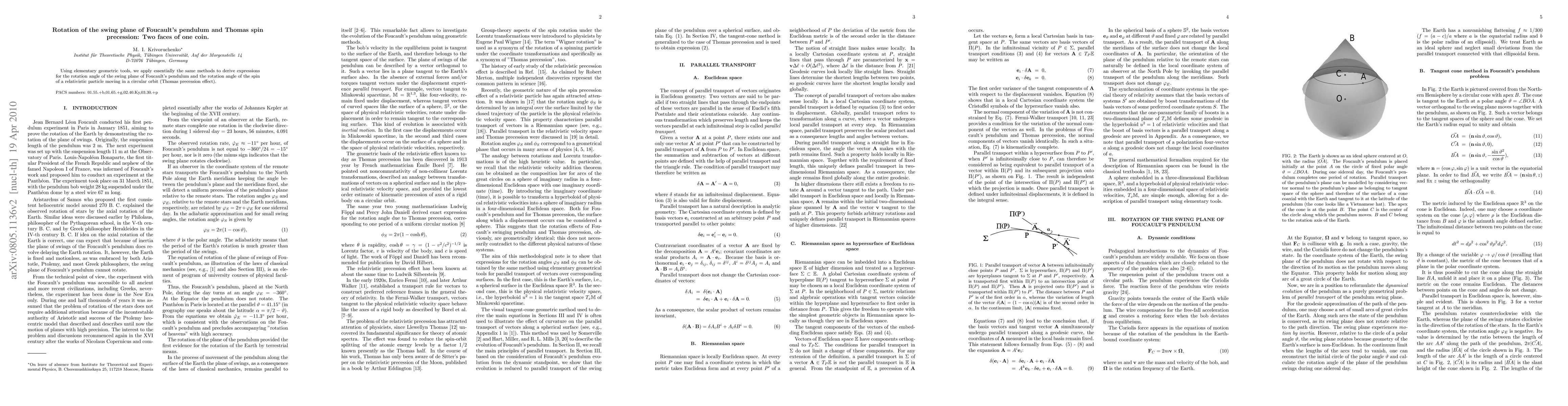 Using elementary geometric tools, we apply essentially the same methods to derive expressions for the rotation angle of the swing plane of Foucault's pendulum and the rotation angle of the spin of a relativistic particle moving in a circular orbit (Thomas precession effect).
