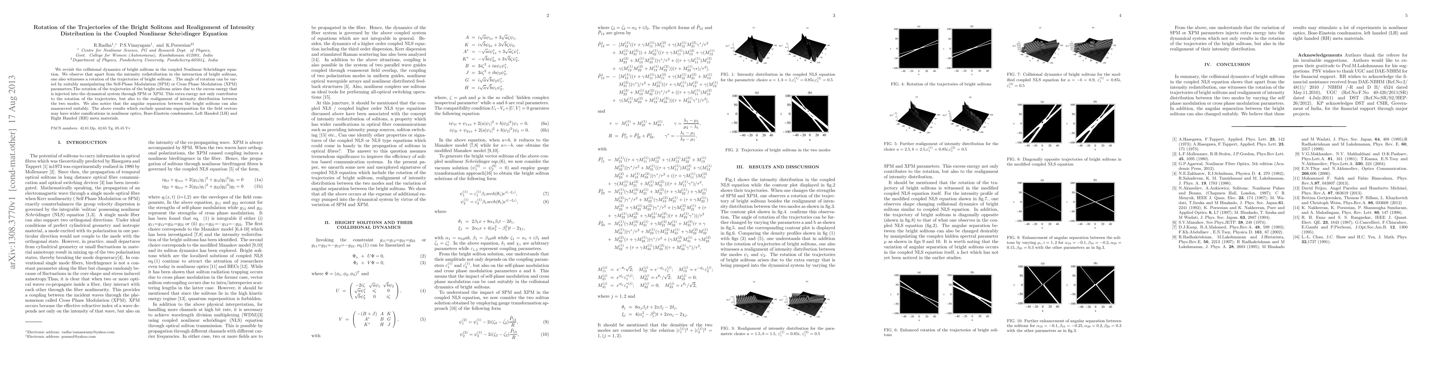 We revisit the collisional dynamics of bright solitons in the coupled Nonlinear Schrodinger equation. We observe that apart from the intensity redistribution in the interaction of bright solitons, one also witnesses a rotation of the trajectories of bright solitons . The angle of rotation can be varied by suitably manipulating the Self-Phase Modulation (SPM) or Cross Phase Modulation (XPM) parameters.The rotation of the trajectories of the bright solitons arises due to the excess energy that is injected into the dynamical system through SPM or XPM. This extra energy not only contributes to the rotation of the trajectories, but also to the realignment of intensity distribution between the two modes. We also notice that the angular separation between the bright solitons can also manouvred suitably. The above results which exclude quantum superposition for the field vectors may have wider ramifications in nonlinear optics, Bose-Einstein condensates, Left Handed (LH) and Right Handed (RH) meta materials.