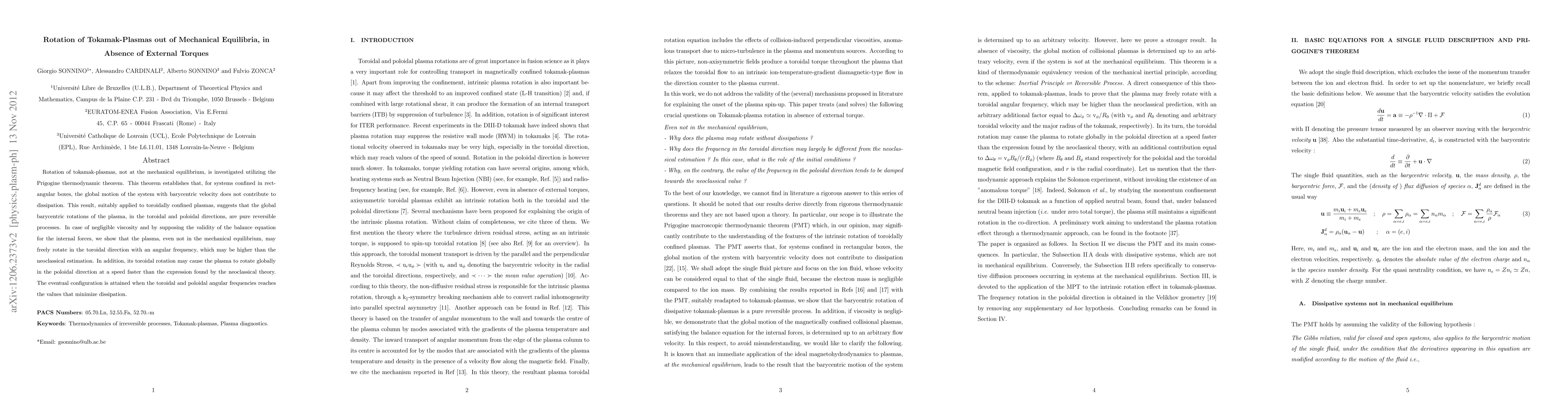 This paper investigates the rotation of tokamak plasmas using Prigogine's thermodynamic theorem, demonstrating that plasmas can rotate freely without external torques, achieving higher angular frequencies than neoclassical estimates, and minimizing dissipation.