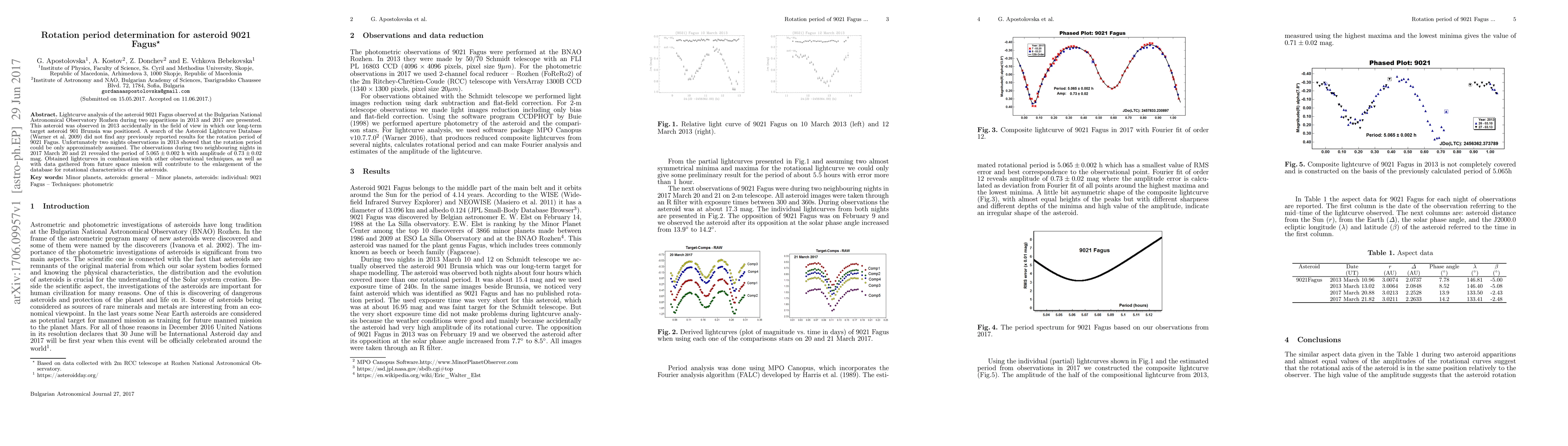 Astronomers have determined the rotation period of asteroid 9021 Fagus to be approximately 5.065 hours with an amplitude of 0.73 magnitudes, providing new insights into the asteroid's rotational characteristics.