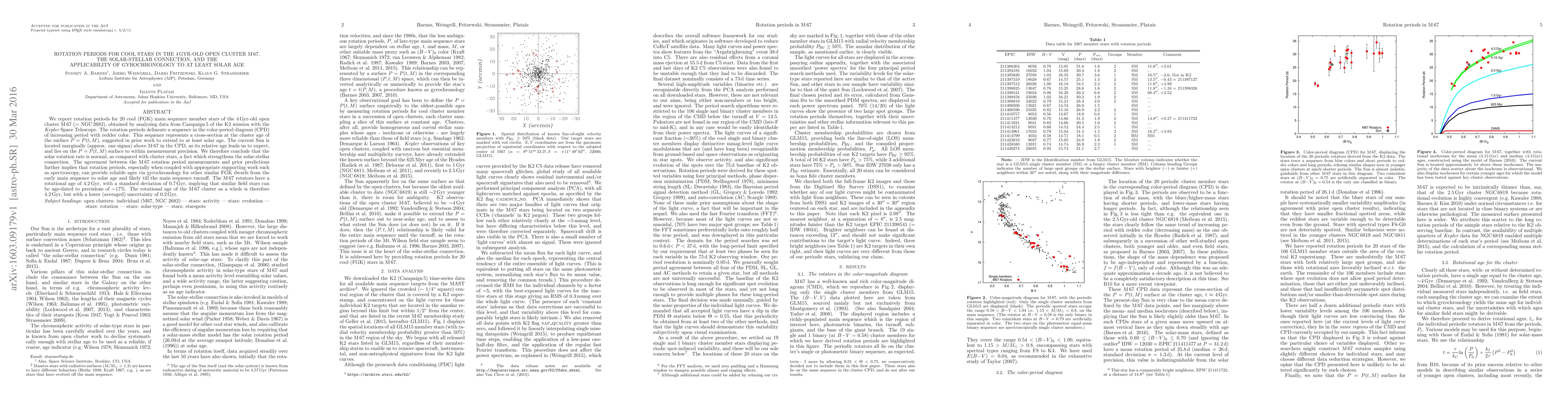 This study reports rotation periods for 20 FGK stars in the 4 Gyr-old M67 cluster, revealing a color-period relationship that supports gyrochronology's applicability to solar-age stars. The Sun's rotation rate aligns with this trend, reinforcing the solar-stellar connection.