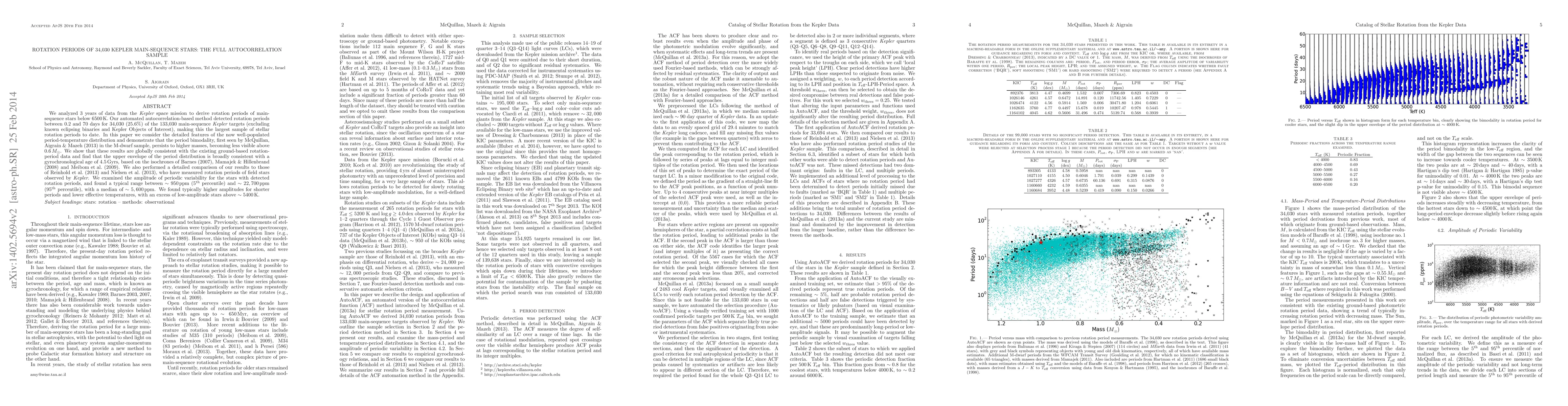 This study analyzed 3 years of Kepler mission data to determine rotation periods for 34,030 main-sequence stars, revealing a bimodal period distribution that persists to higher masses but diminishes above 0.6 M_sun. The results align with existing ground-based data and suggest an age of 4.5 Gyrs for the upper period envelope.