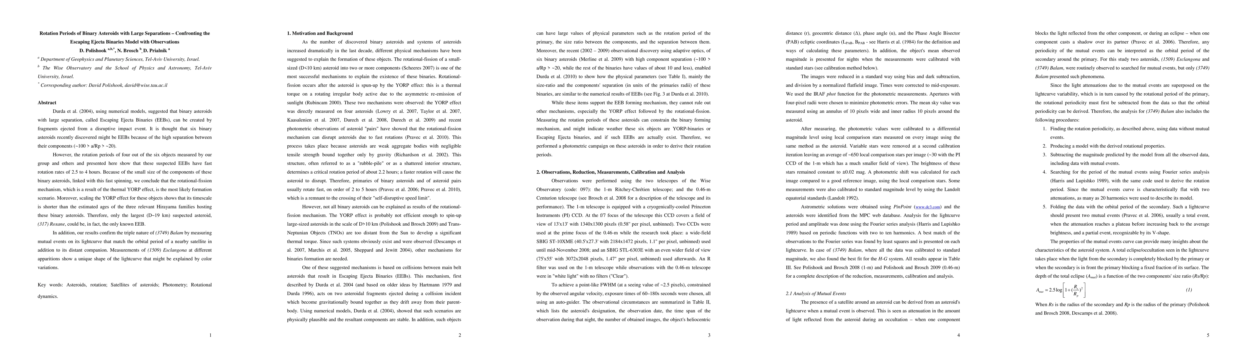 Durda et al. (2004), using numerical models, suggested that binary asteroids with large separation, called Escaping Ejecta Binaries (EEBs), can be created by fragments ejected from a disruptive impact event. It is thought that six binary asteroids recently discovered might be EEBs because of the high separation between their components (~100 > a/Rp > ~20). However, the rotation periods of four out of the six objects measured by our group and others and presented here show that these suspected EEBs have fast rotation rates of 2.5 to 4 hours. Because of the small size of the components of these binary asteroids, linked with this fast spinning, we conclude that the rotational-fission mechanism, which is a result of the thermal YORP effect, is the most likely formation scenario. Moreover, scaling the YORP effect for these objects shows that its timescale is shorter than the estimated ages of the three relevant Hirayama families hosting these binary asteroids. Therefore, only the largest (D~19 km) suspected asteroid, (317) Roxane, could be, in fact, the only known EEB. In addition, our results confirm the triple nature of (3749) Balam by measuring mutual events on its lightcurve that match the orbital period of a nearby satellite in addition to its distant companion. Measurements of (1509) Esclangona at different apparitions show a unique shape of the lightcurve that might be explained by color variations.